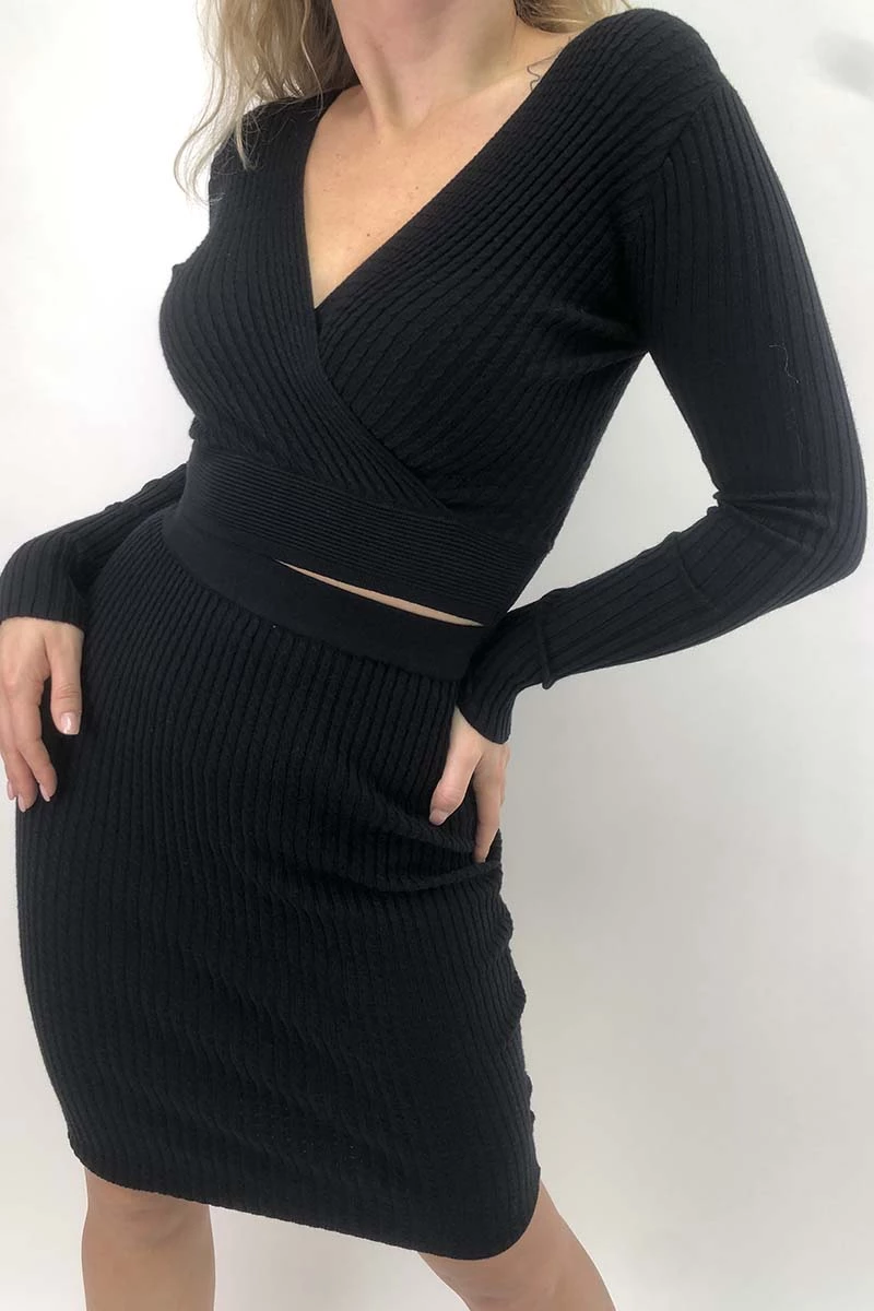 Ультрамодный юбочный костюм с глубоким v-образным вырезом на