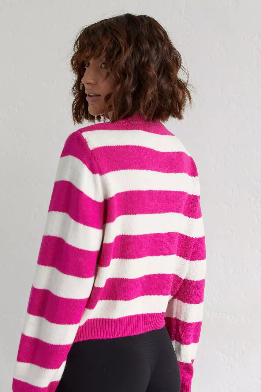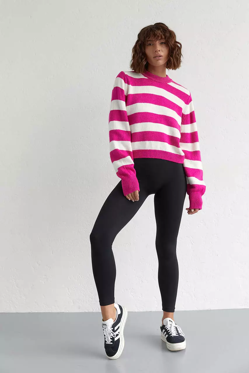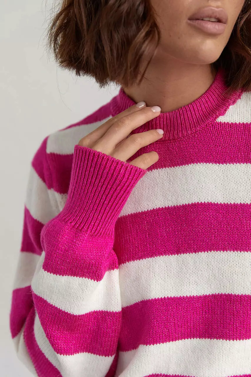 Эта модель в стиле oversize полностью украшена горизонтальными полосками. Проймы в изделии опущены, прямой низ и длинные рукава заканчиваются однотонной вязкой в виде манжет.
