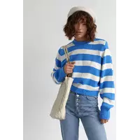 Эта модель в стиле oversize полностью украшена горизонтальными полосками. Проймы в изделии опущены, прямой низ и длинные рукава заканчиваются однотонной вязкой в виде манжет.