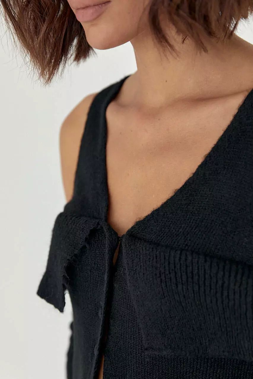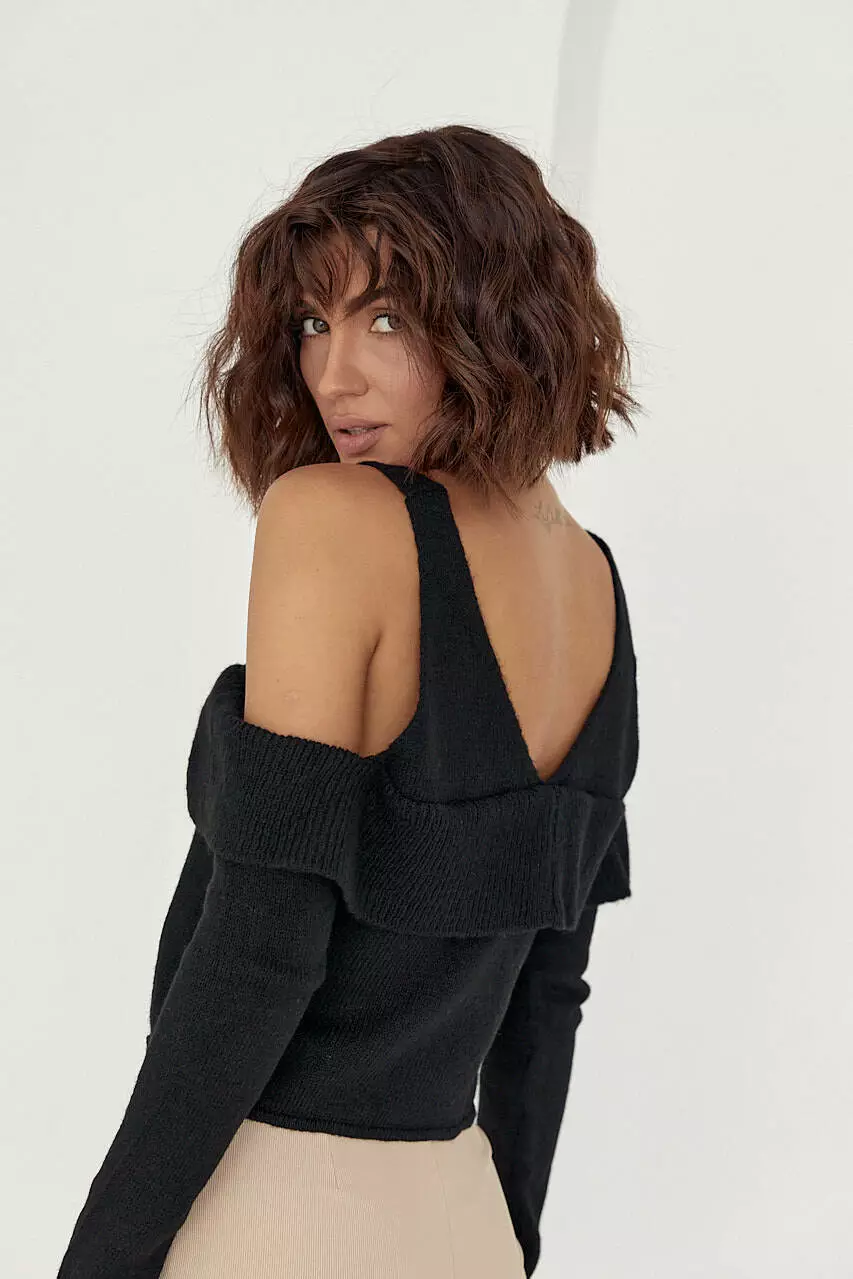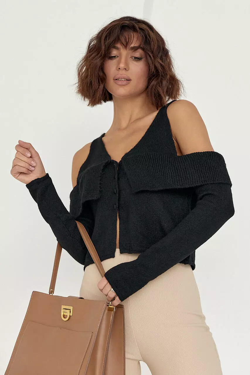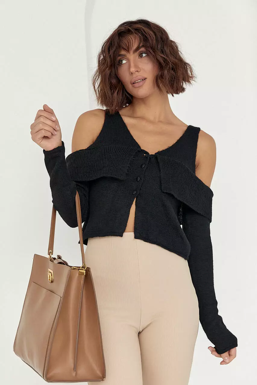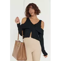 Вязаный пуловер на пуговицах с открытыми плечами - черный цвет, L (есть размеры)