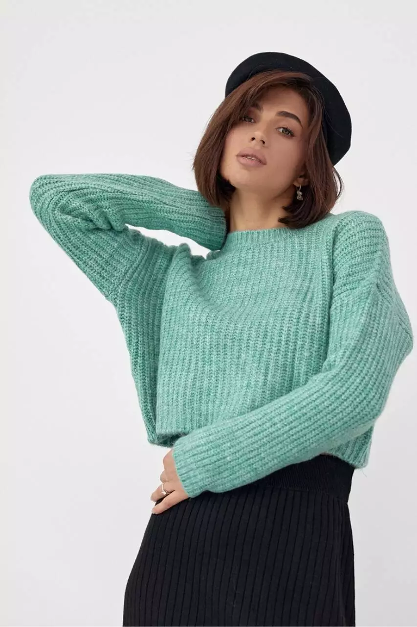 В этой укороченной модели плечи удлиненные, а круглая горловина дополнена бейкой с тонкой резинкой, вшитой по краям. Прямой низ и длинные рукава заканчиваются вязкой в виде манжет.