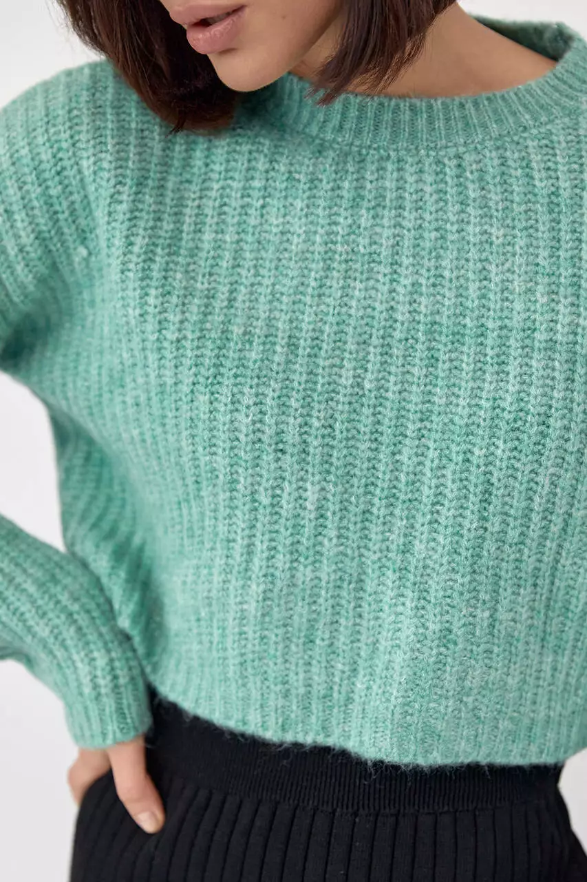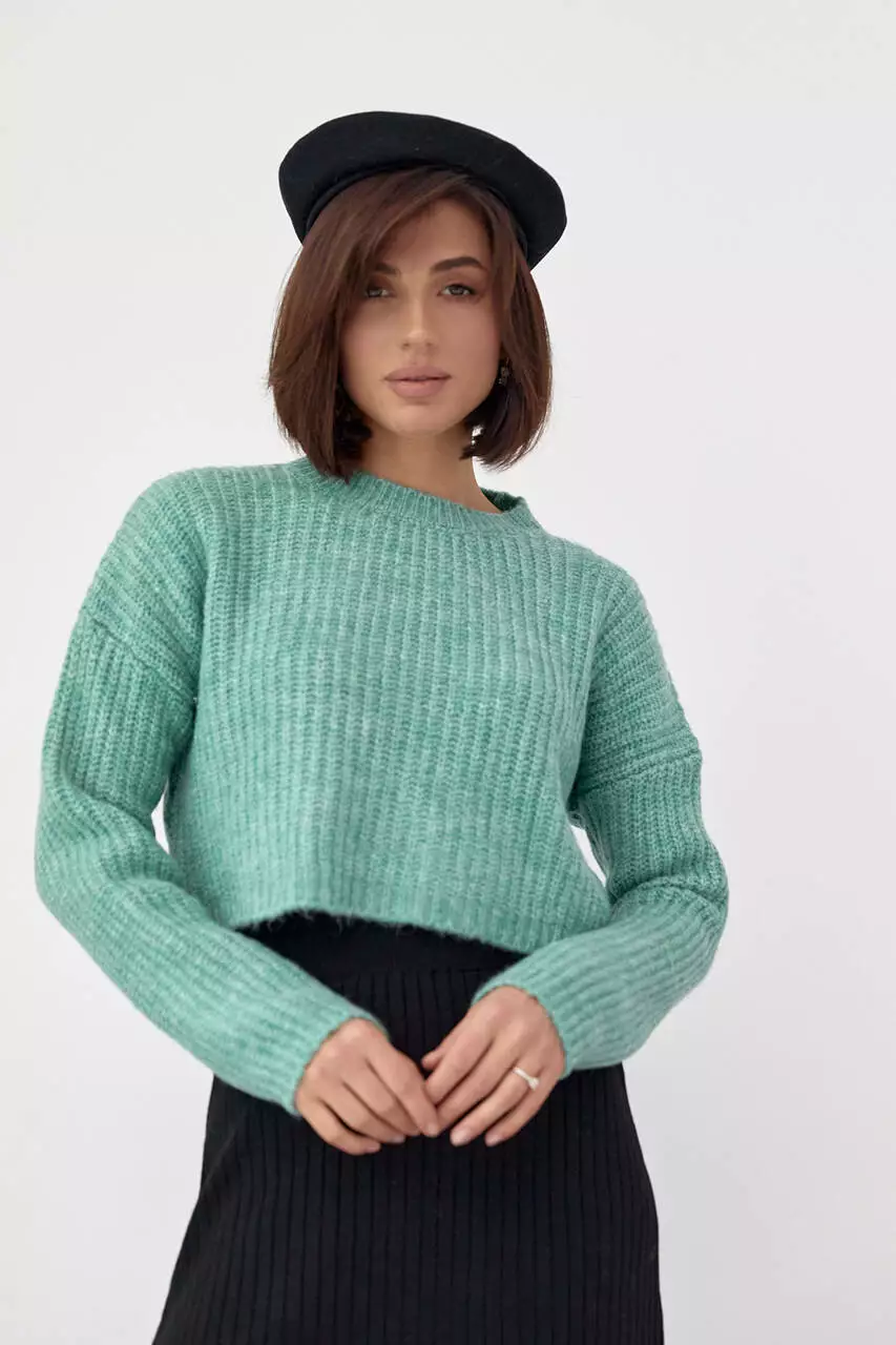 В этой укороченной модели плечи удлиненные, а круглая горловина дополнена бейкой с тонкой резинкой, вшитой по краям. Прямой низ и длинные рукава заканчиваются вязкой в виде манжет.