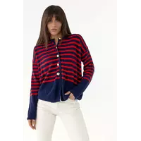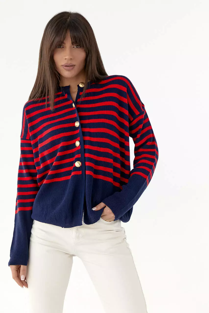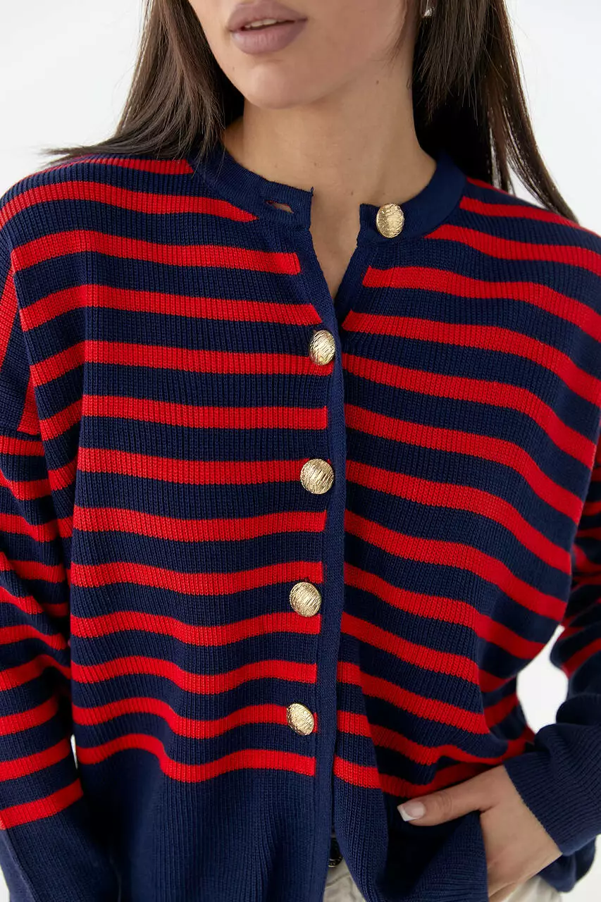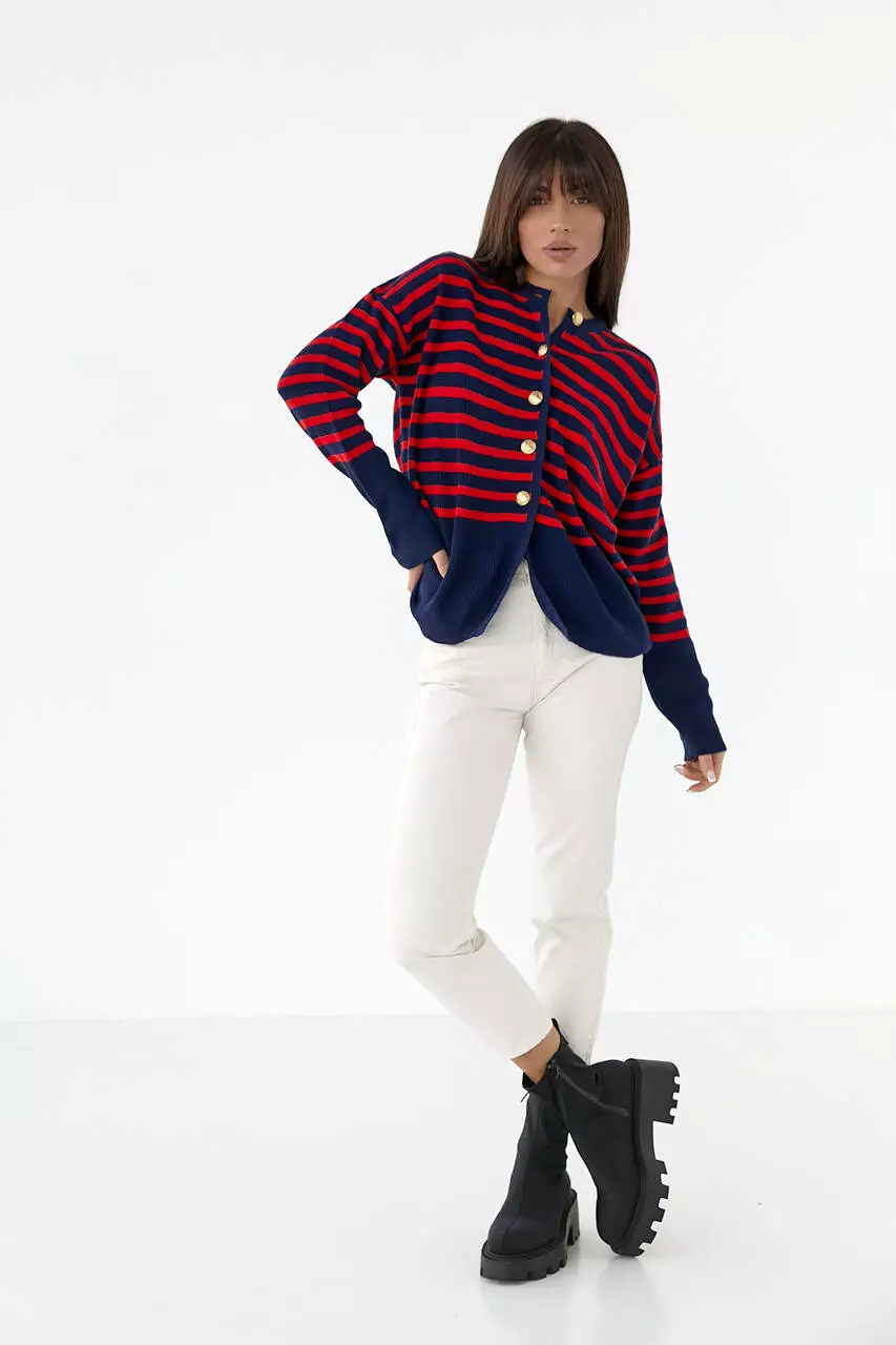 Эта модель украшена цветными горизонтальными полосками и спереди застегивается на пять пуговиц. Горловина в изделии круглая, линия плеча удлиненная.