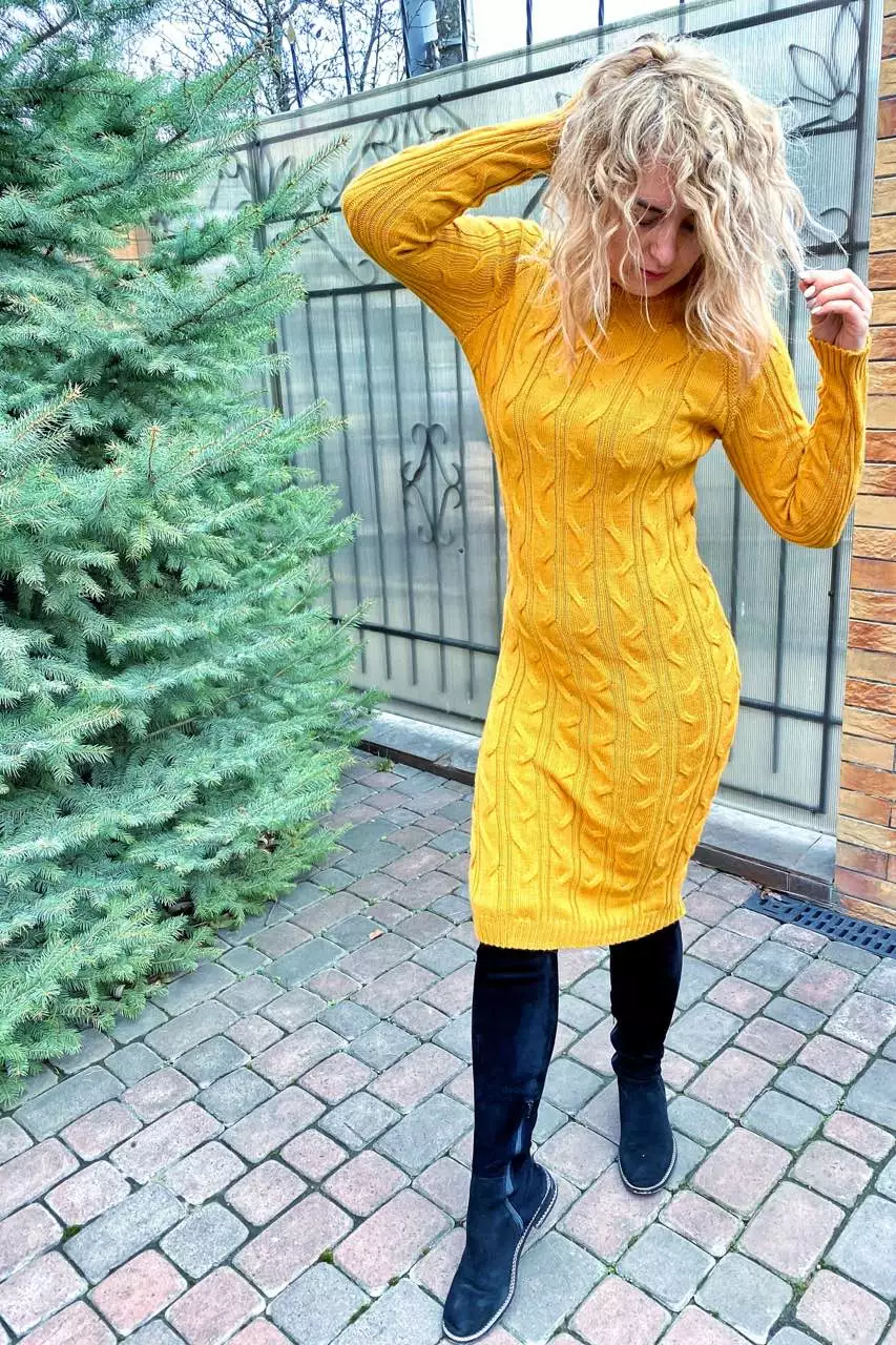 Вязанное платье длины миди с красивой объемной вязкой - горчичный цвет, S
