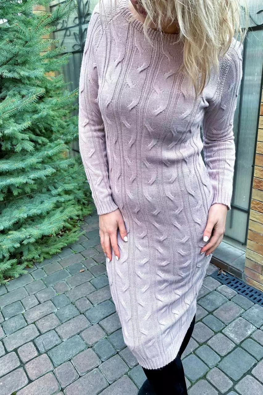 Вязанное платье длины миди с красивой объемной вязкой - пудра цвет, L