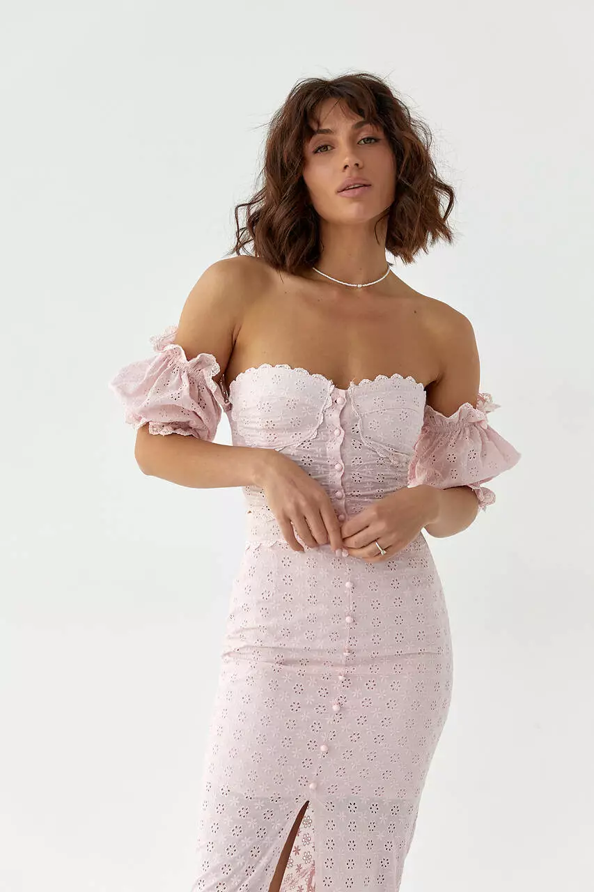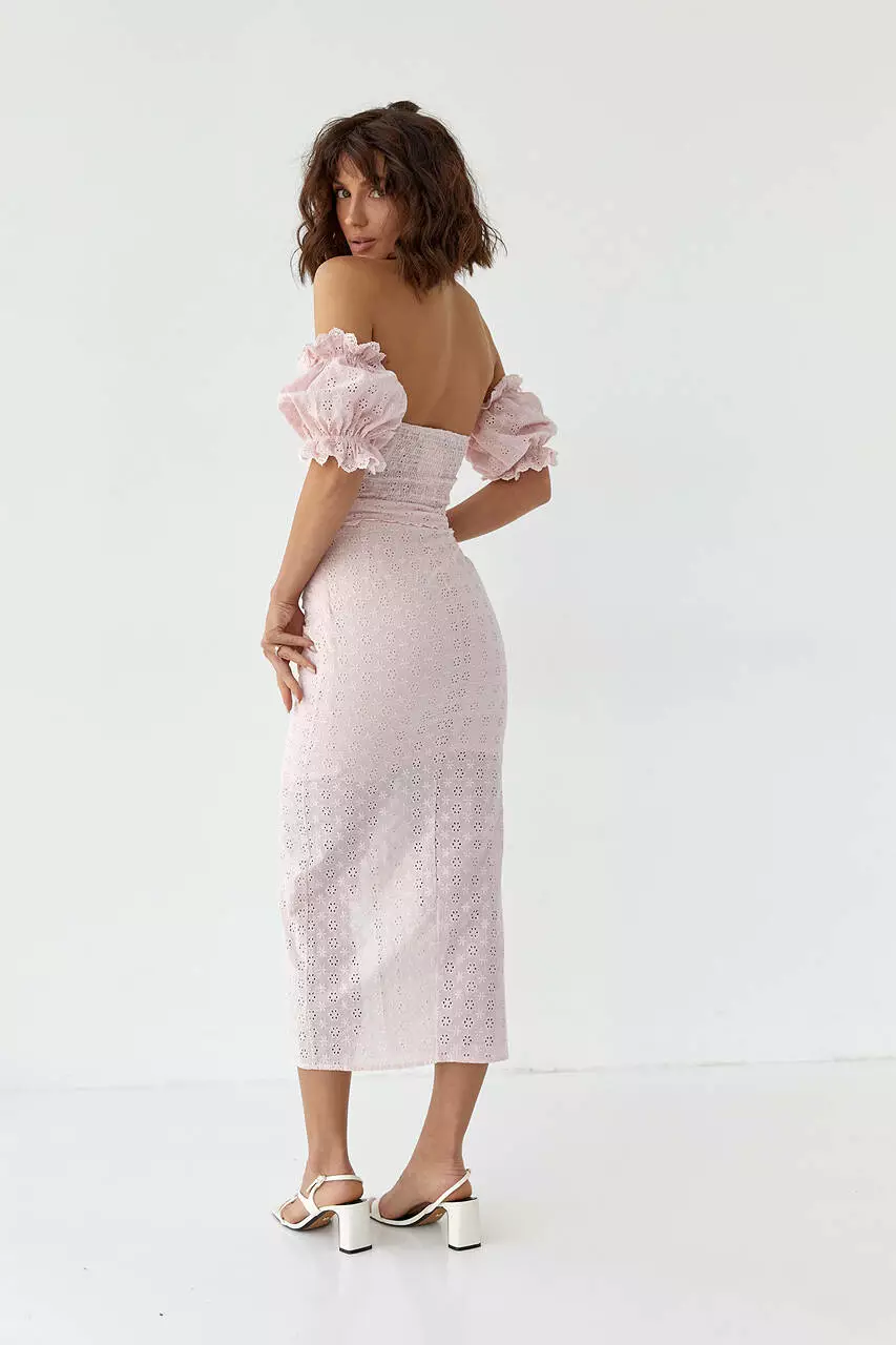 Юбочный костюм с топом-бюстье и юбкой миди из прошвы - пудра цвет, S (есть размеры)
