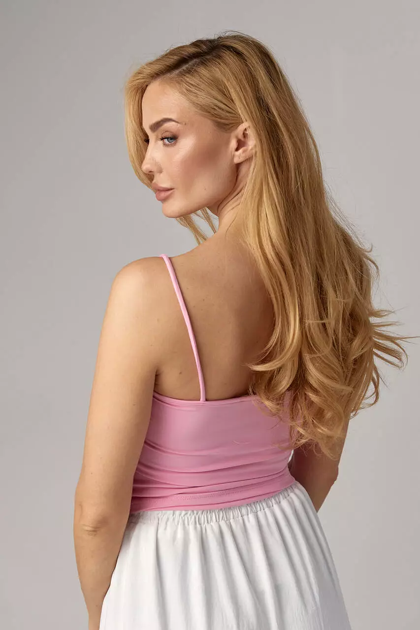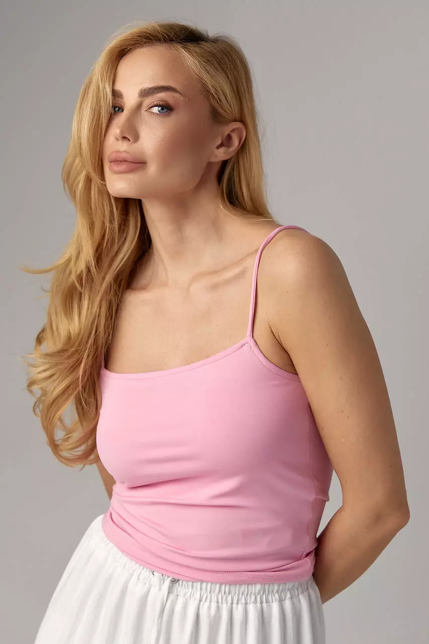 Модель на тонких бретелях без регулировки длины сшита из эластичной ткани, с прямым низом. Часть майки спереди имеет подкладку из основной ткани.