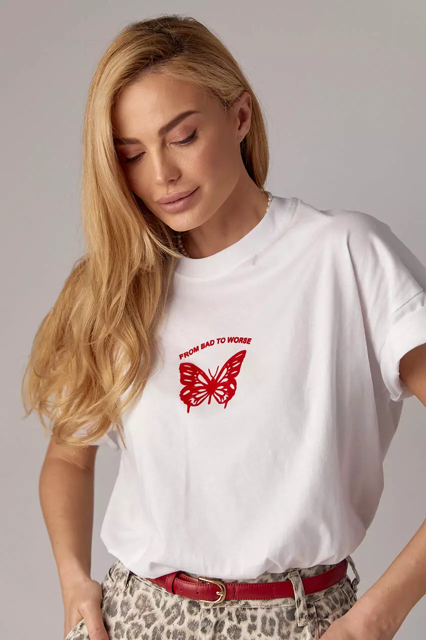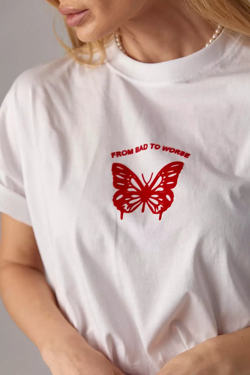 Эта женская трикотажная футболка oversize — воплощение стиля и непринужденности. Её свободный крой обеспечивает максимальный комфорт и свободу движений, а передняя часть украшена оригинальным принтом в виде бабочки и надписью "From bad to worse".