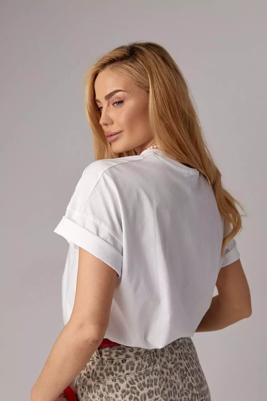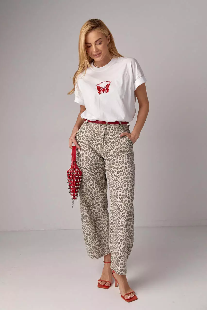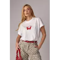 Принт с бабочкой добавляет футболке нотку легкости и воздушности, придавая образу нежности и романтики.