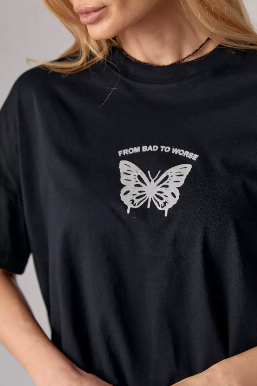 Эта женская трикотажная футболка oversize — воплощение стиля и непринужденности. Её свободный крой обеспечивает максимальный комфорт и свободу движений, а передняя часть украшена оригинальным принтом в виде бабочки и надписью "From bad to worse".