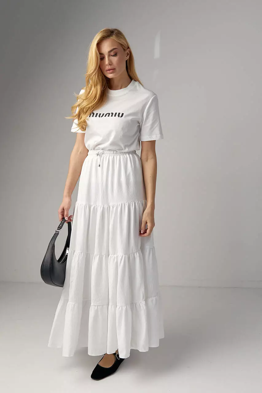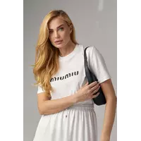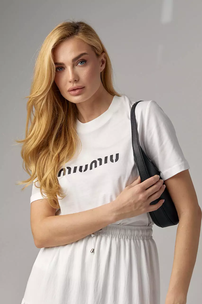 Эта женская трикотажная футболка станет ярким акцентом вашего образа благодаря стильной надписи "Miu Miu" на передней части. Элегантный шрифт добавляет изысканности, а контрастные цвета делают надпись выразительной.