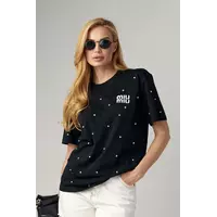 Стразы крепятся к ткани с помощью металлической "ножки". Слева на футболке вышита надпись "Miu Miu", добавляя изделию стильный и модный вид.