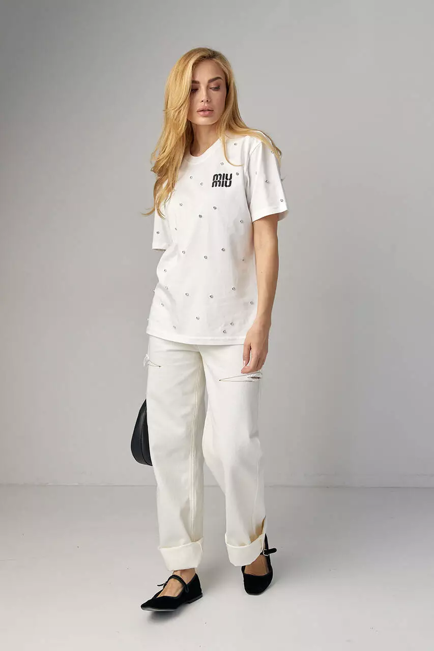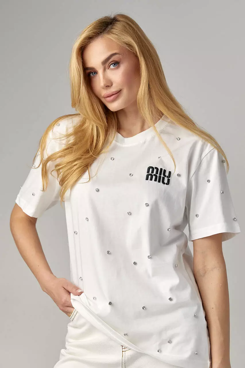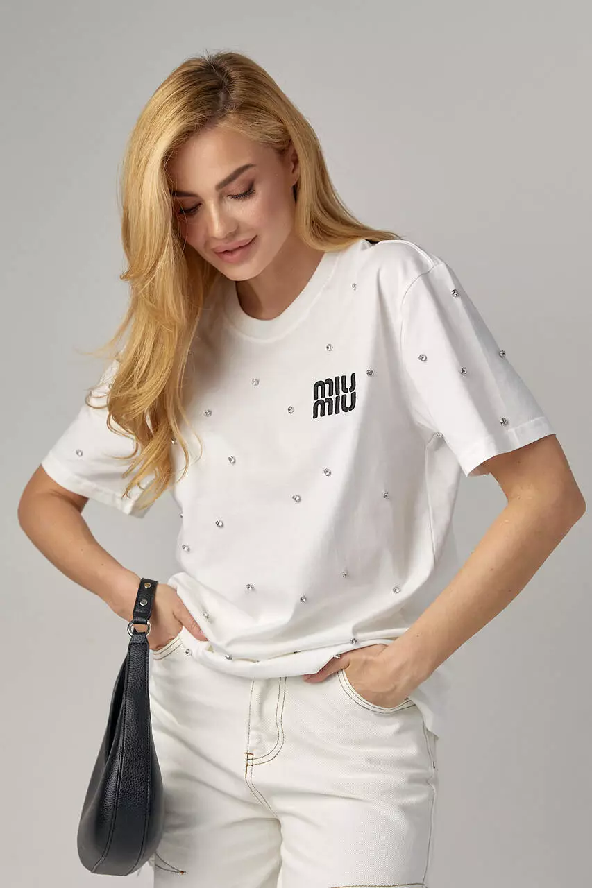 Женская футболка со стразами и вышитой надписью Miu Miu - молочный цвет, L (есть размеры)
