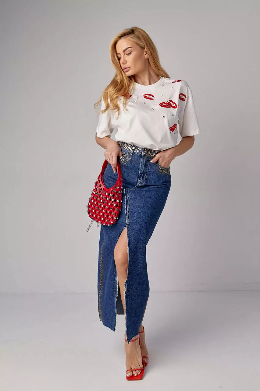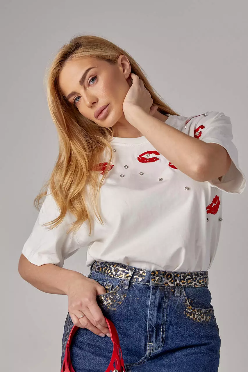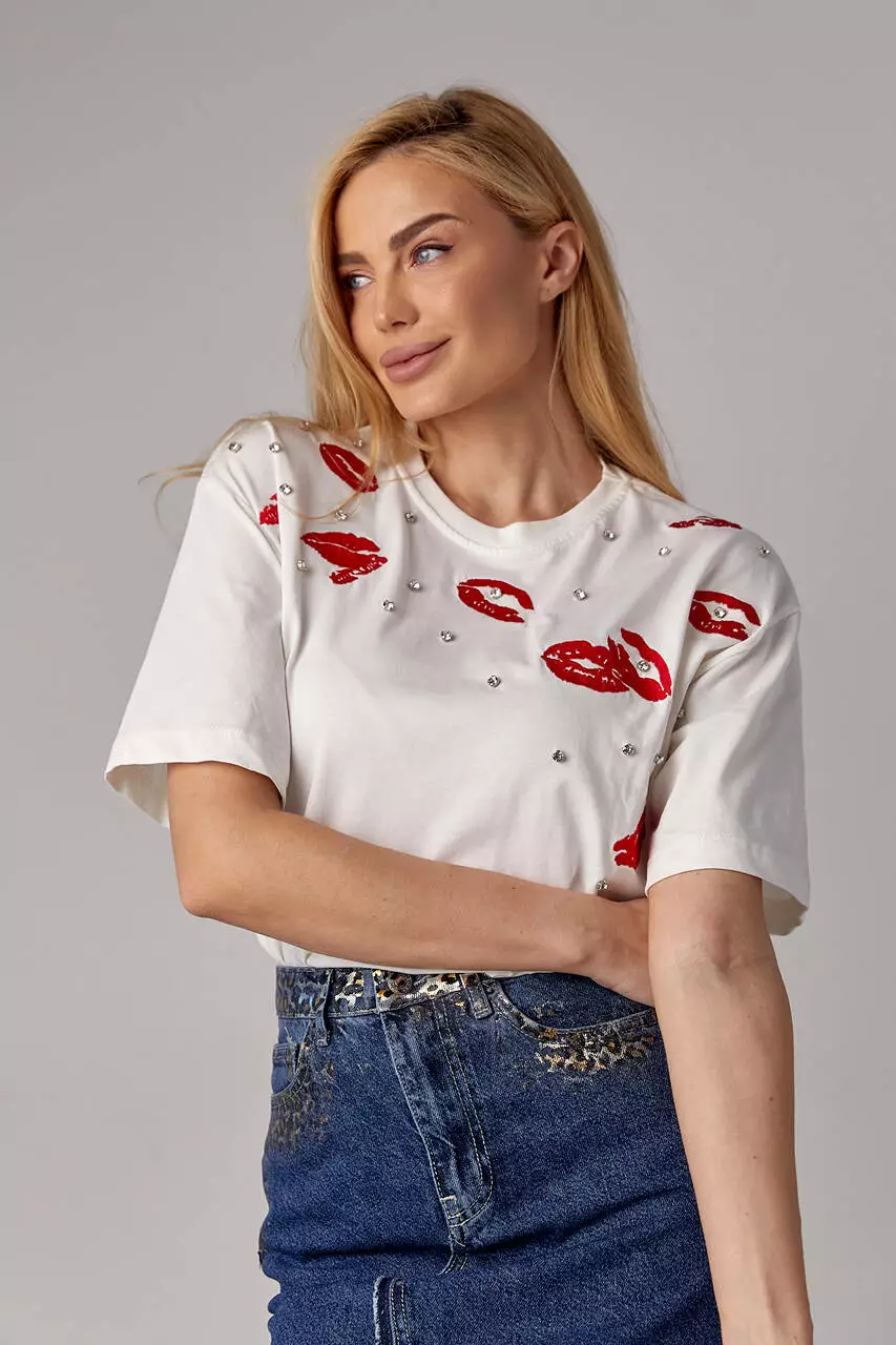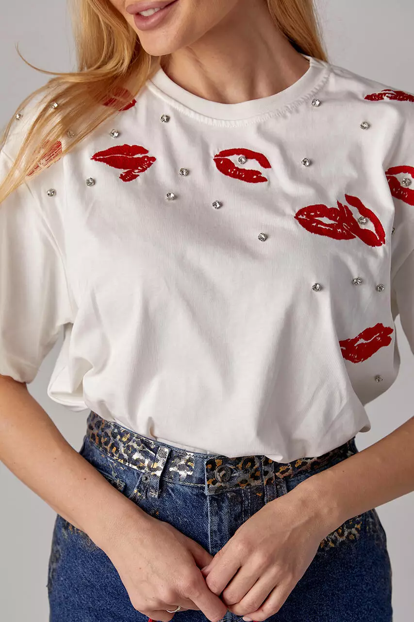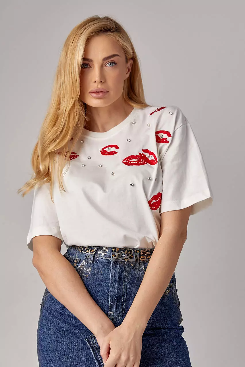 Эта женская трикотажная футболка — настоящий акцент стиля и индивидуальности. Её передняя часть украшена вышитыми губами, которые придают образу игривости и чувственности.