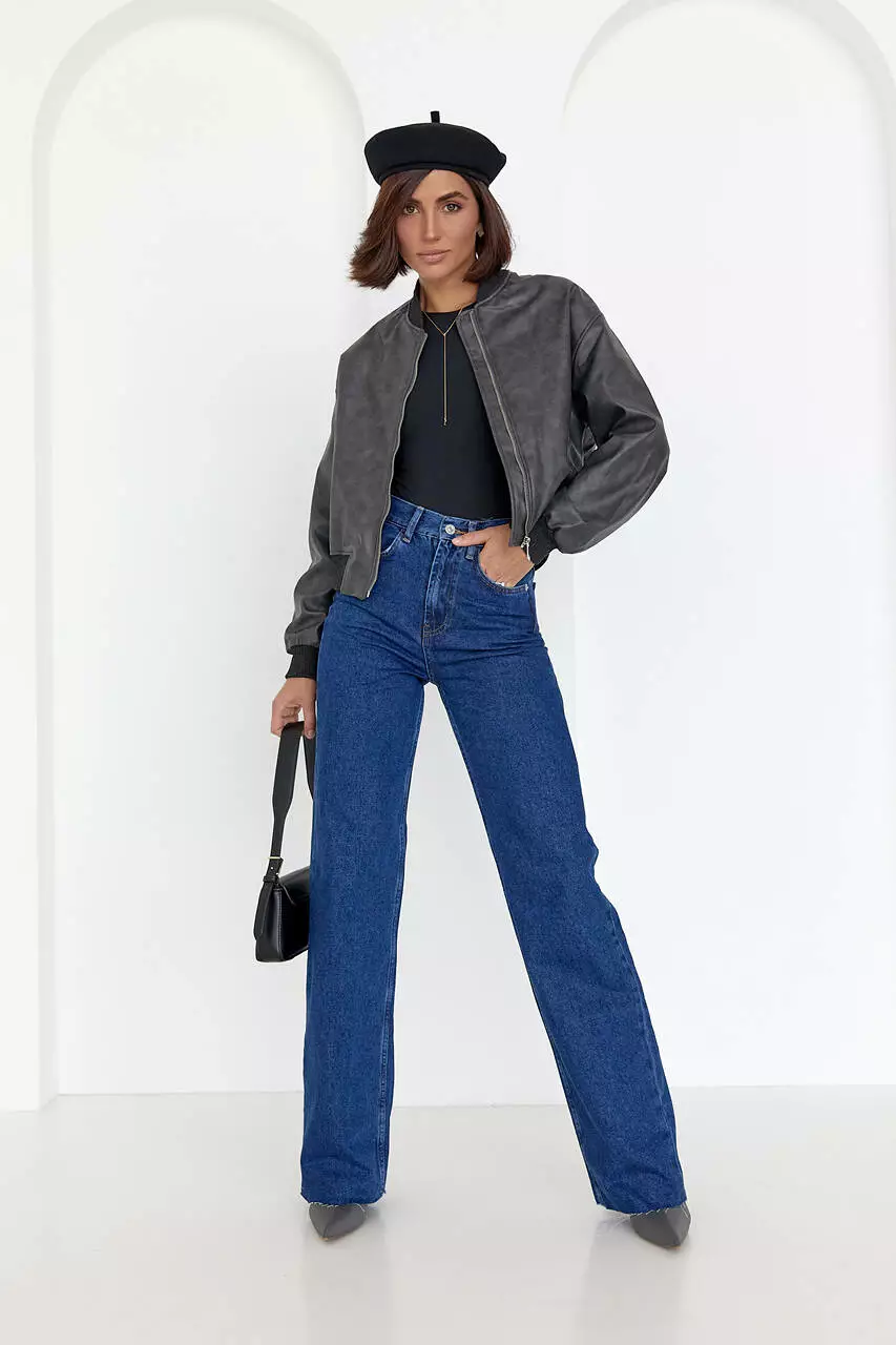 В модели прямой низ и длинные рукава дополнены манжетами из трикотажа в рубчик. Также в бомбере есть небольшой воротничок-стойка.