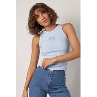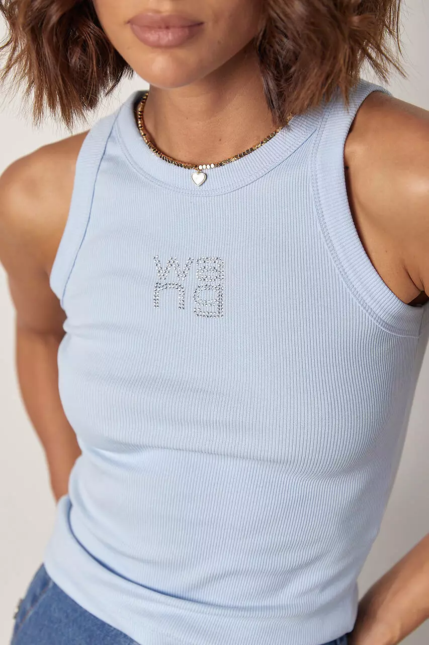 Женская майка в рубчик с надписью Wang из термостраз - голубой цвет, S (есть размеры)