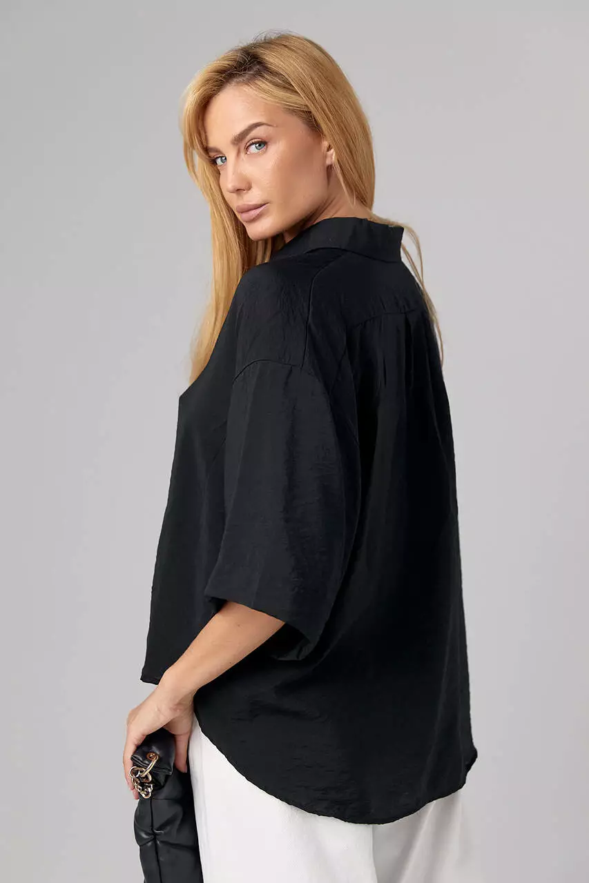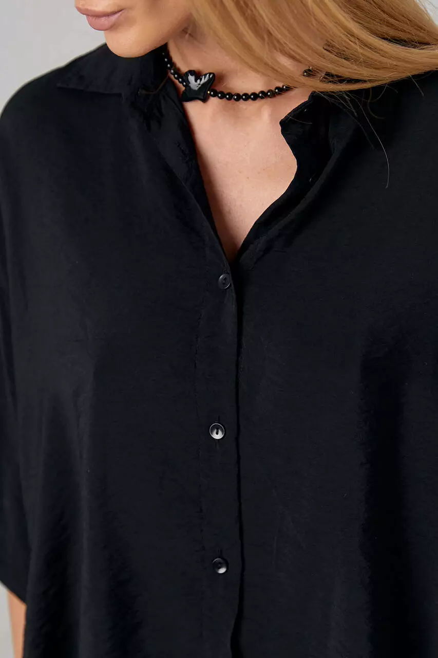 Наша новинка спереди застегивается на пуговицы, которые добавляют классический акцент. Низ рубашки полукруглый.