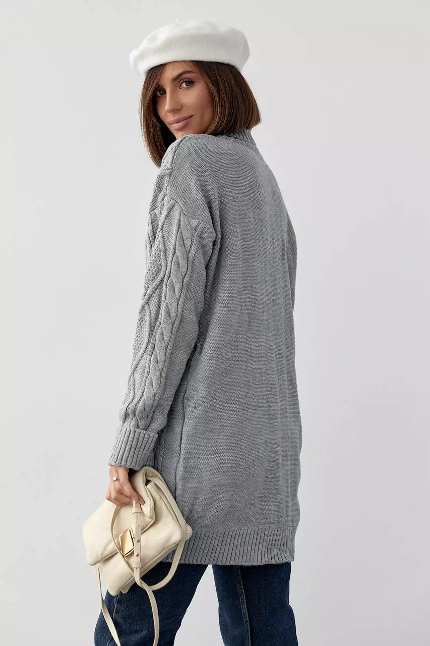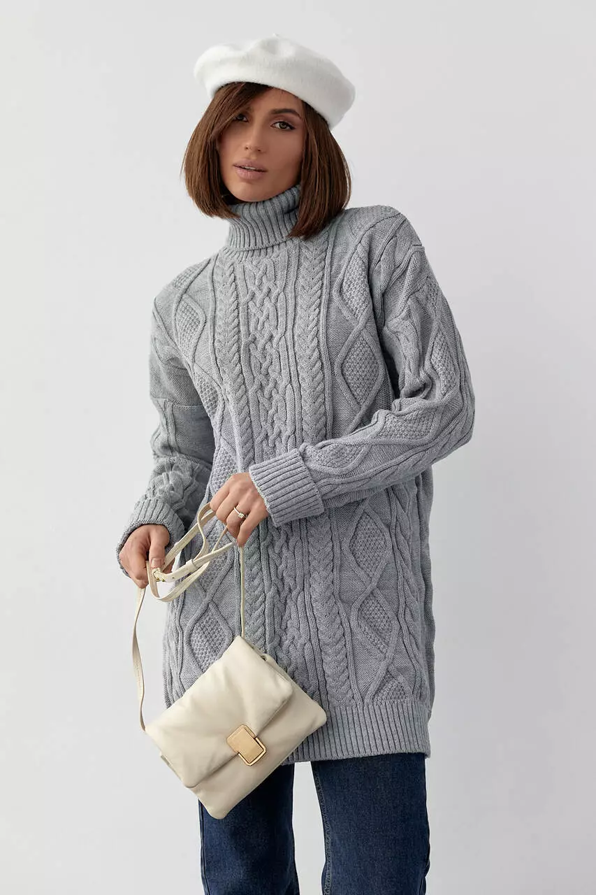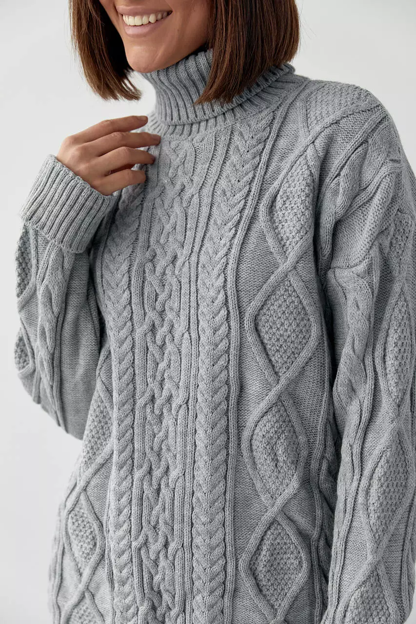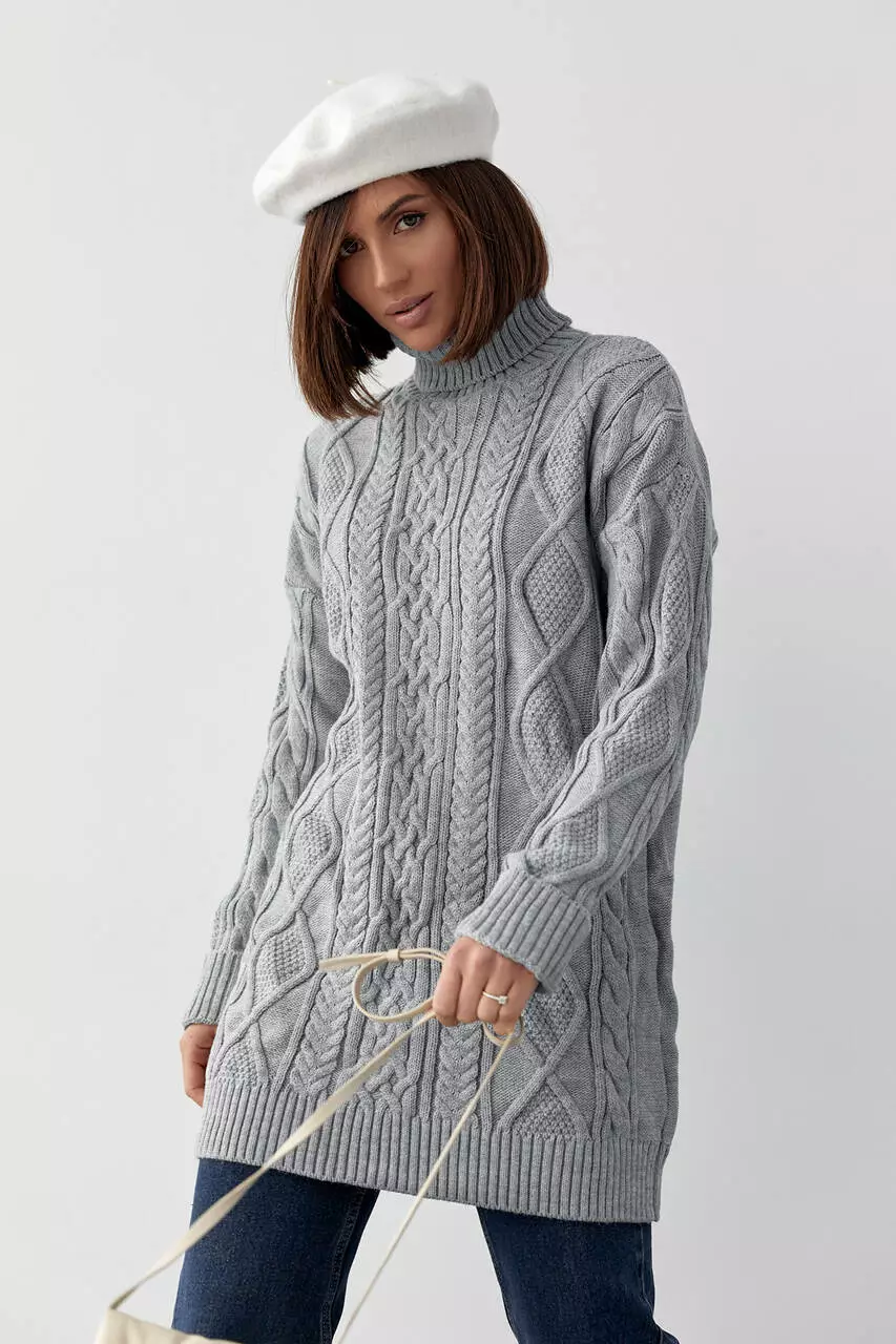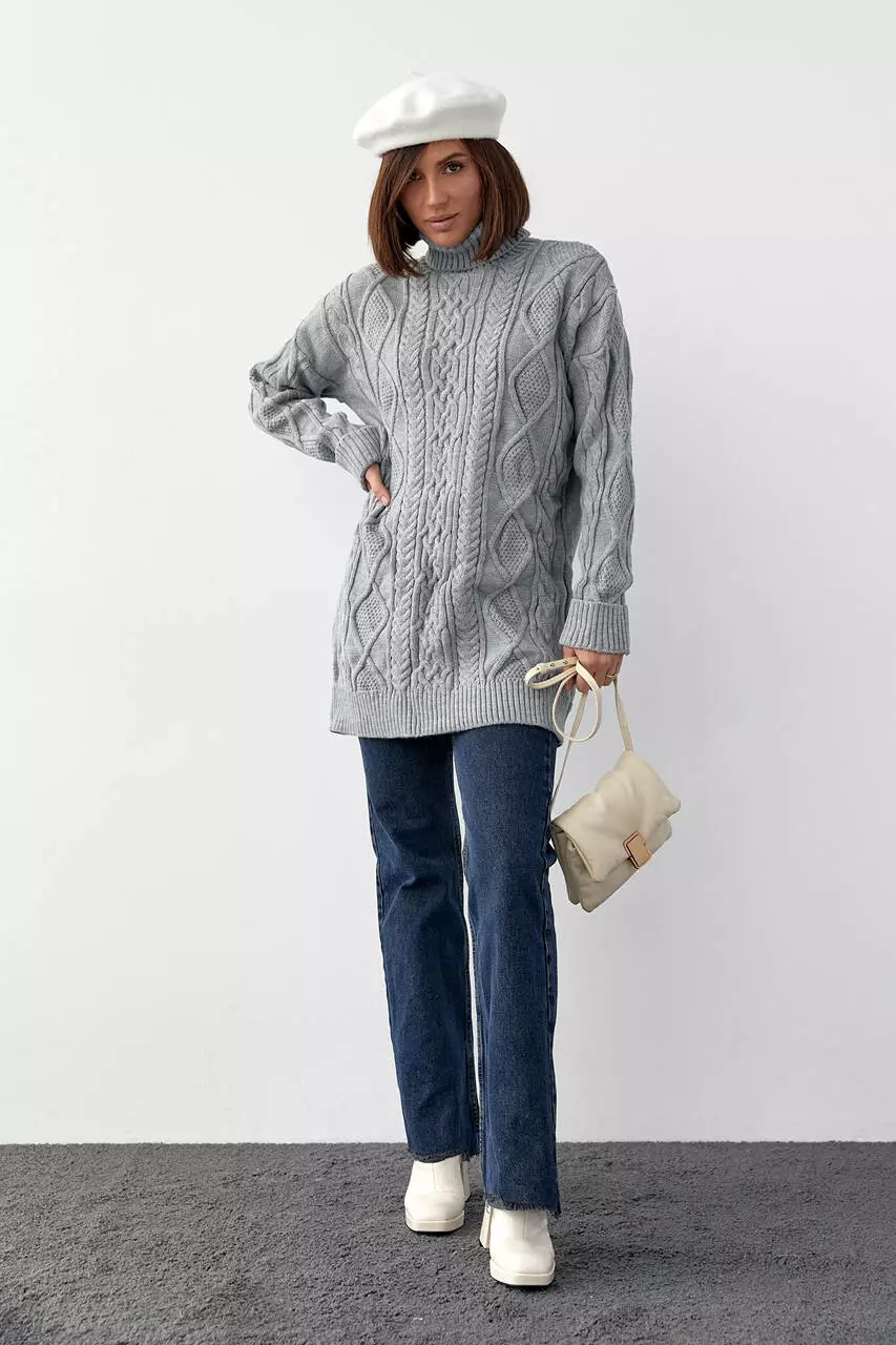 Женская вязаная туника с высоким воротником и косичками - серый цвет, L (есть размеры)