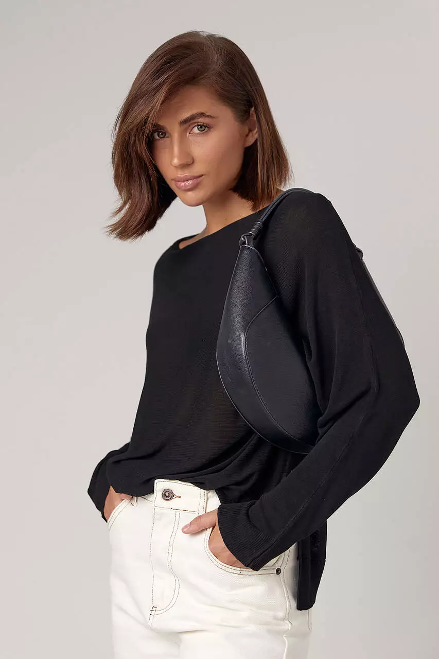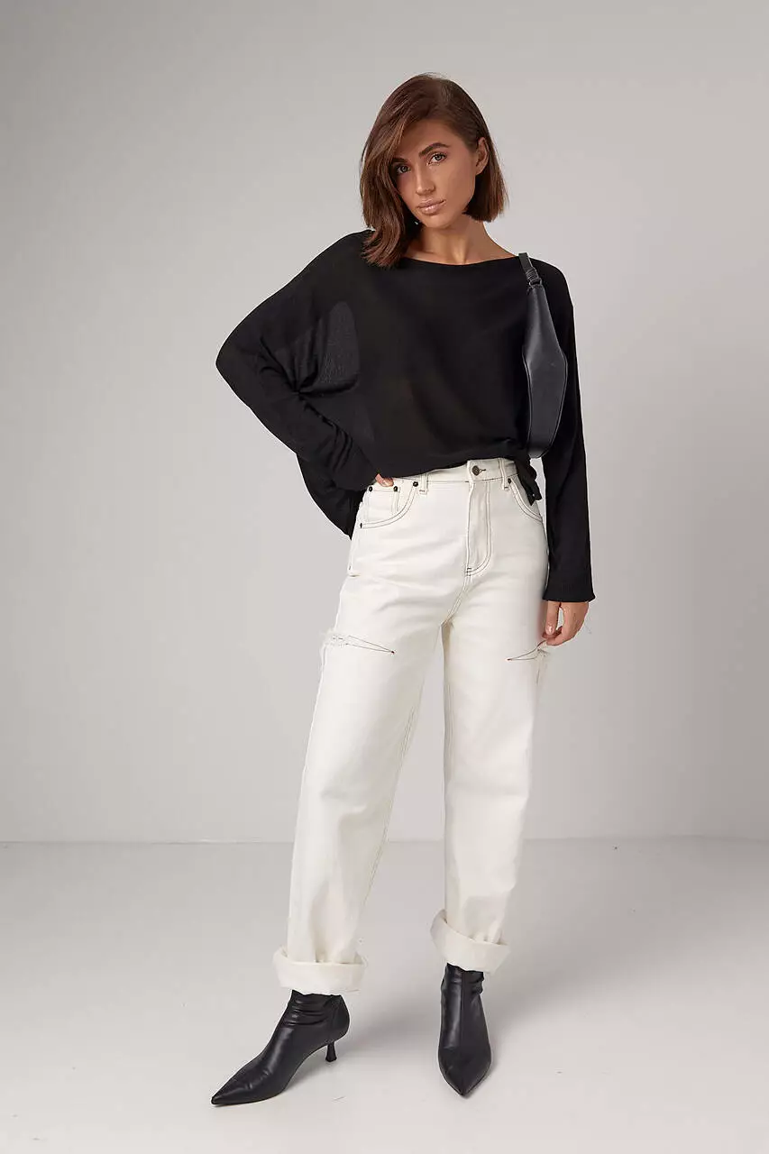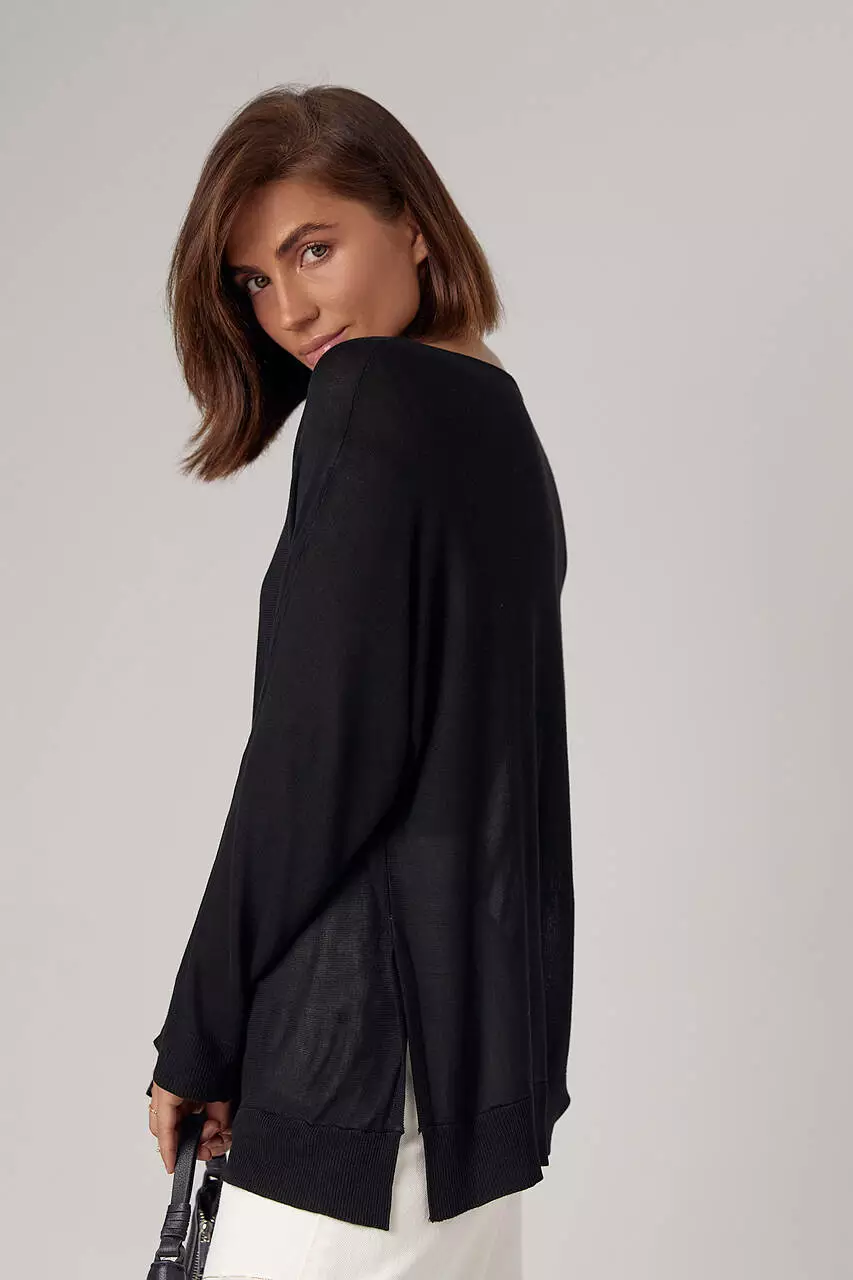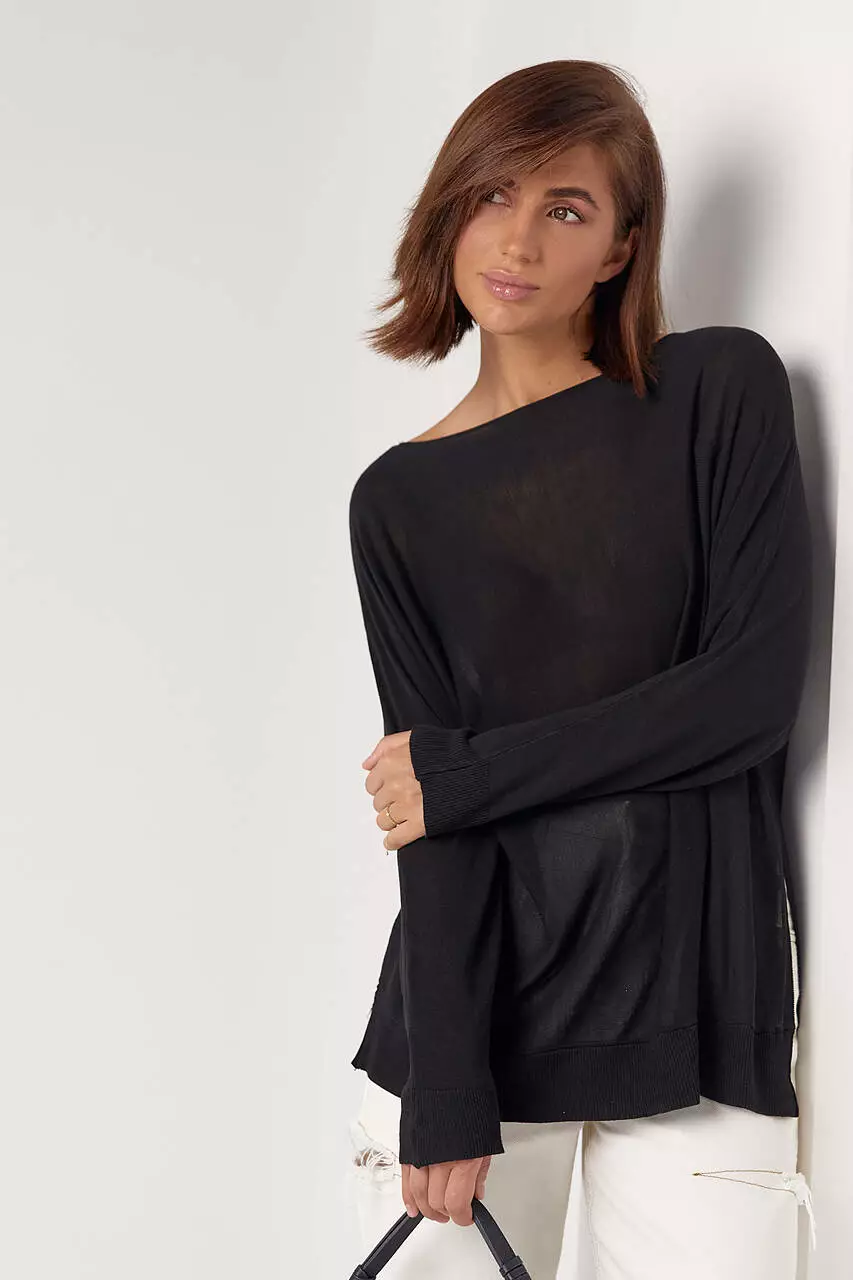Модель полностью выполнена из вискозной машинной вязки. Прямой низ и рукава заканчиваются манжетами.