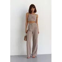 Этот комплект сшит из хлопковой ткани. Штаны в костюме идут с высокой посадкой, без втачного пояса. По линии талии пришиты небольшие тепли для пояса, который входит в комплект.