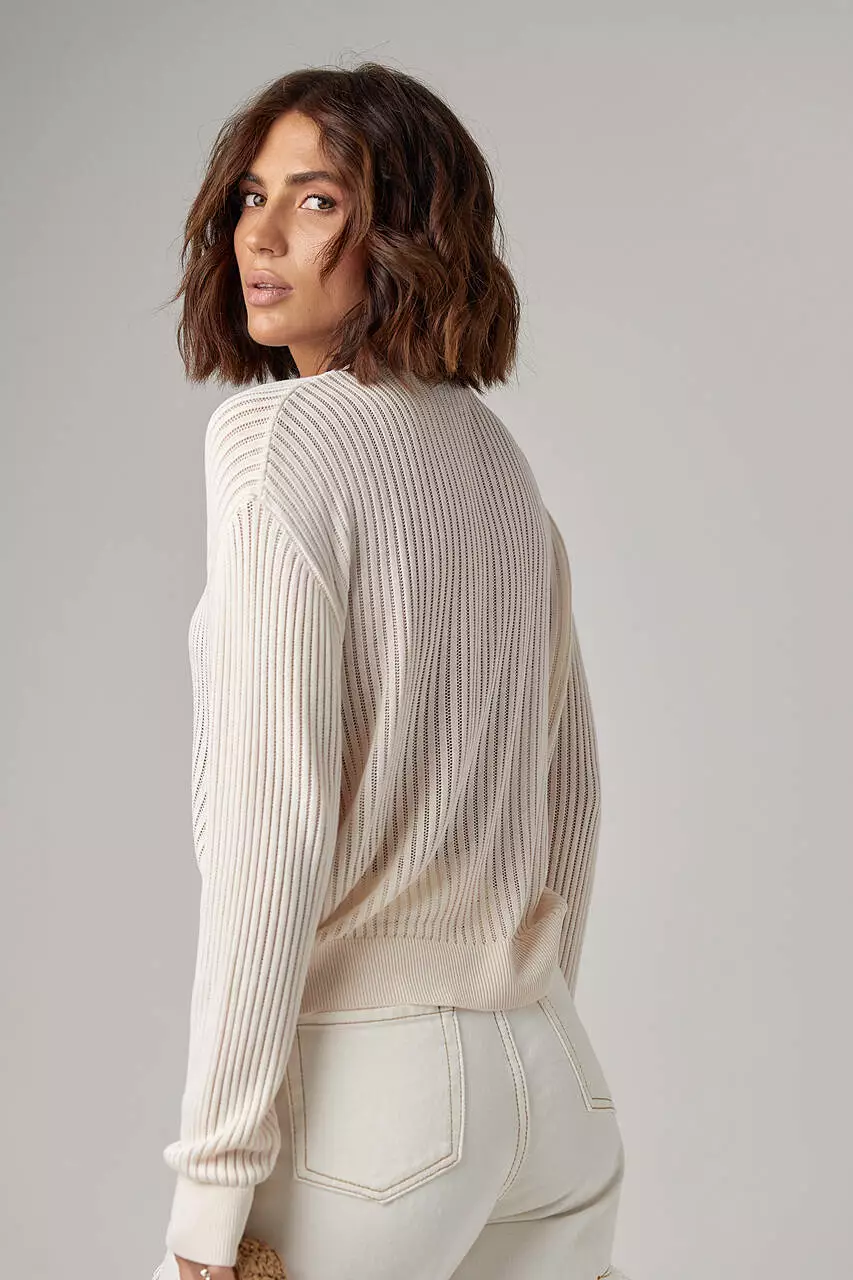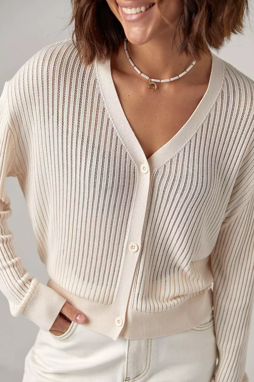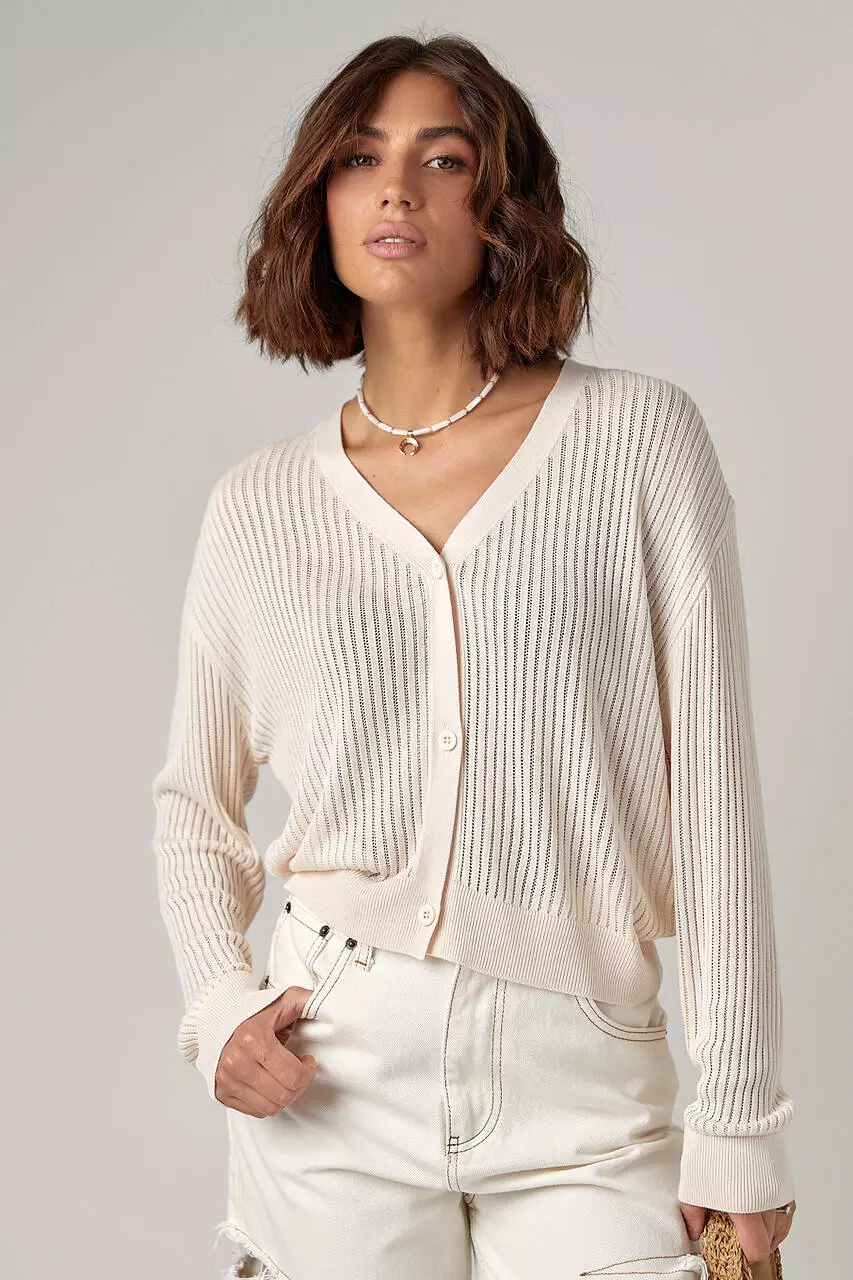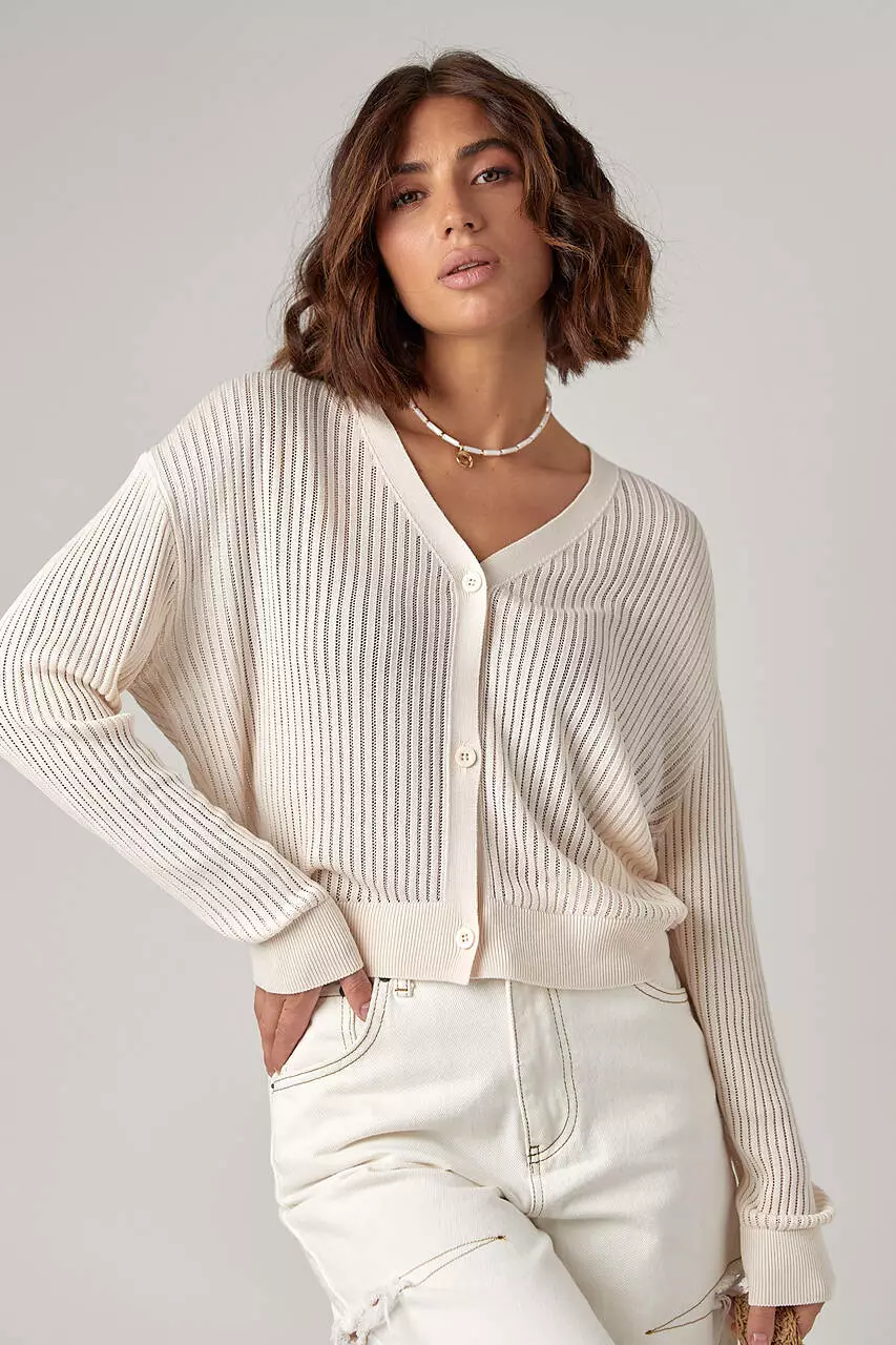 Этот модный кардиган из ажурной машинной вязки добавит шарма твоим образам, расставив в них финальные акценты.