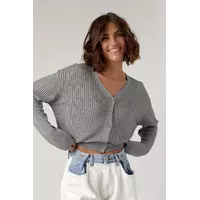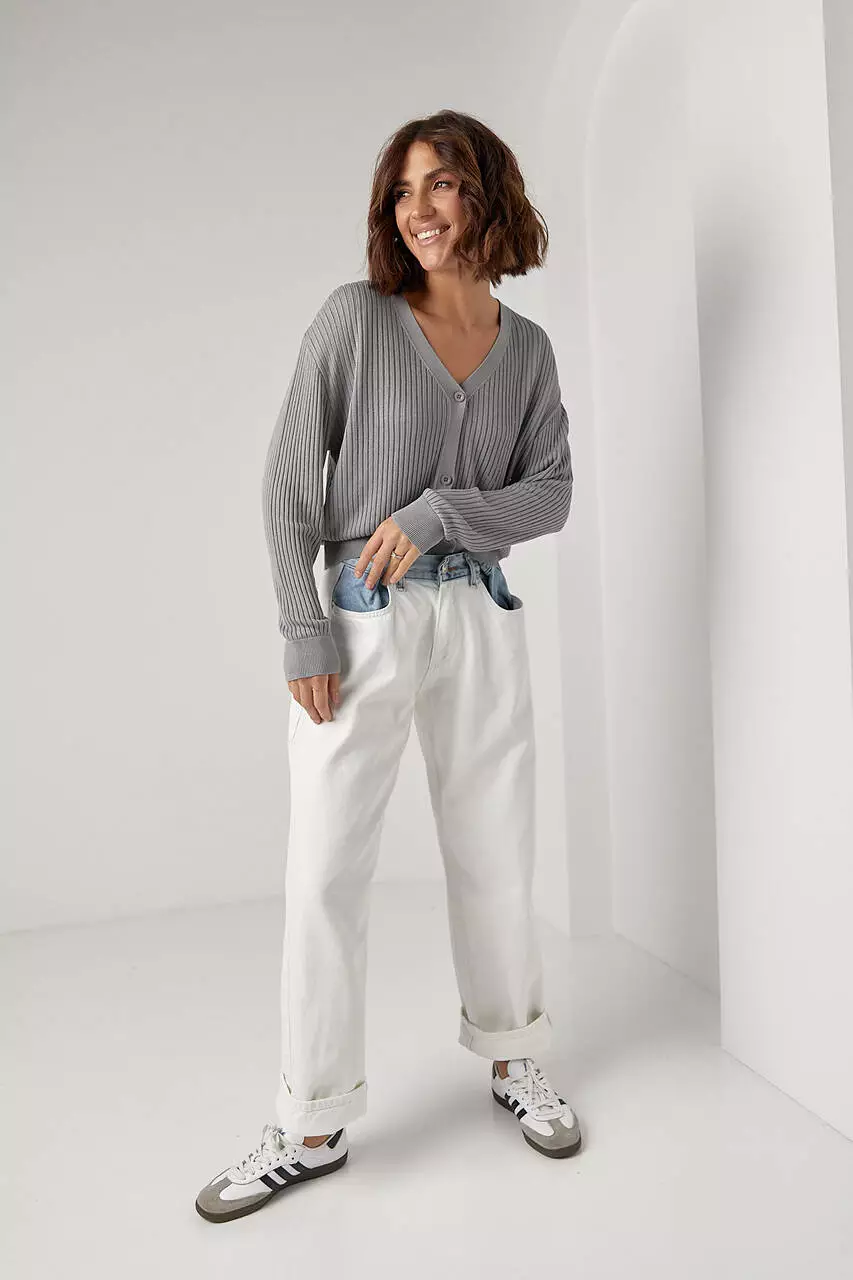 В изделии края прямого низа, V-образной горловины и длинных рукавов выполнены из плотной вязки в мелкий рубчик. Застегивается модель спереди на три пуговицы.