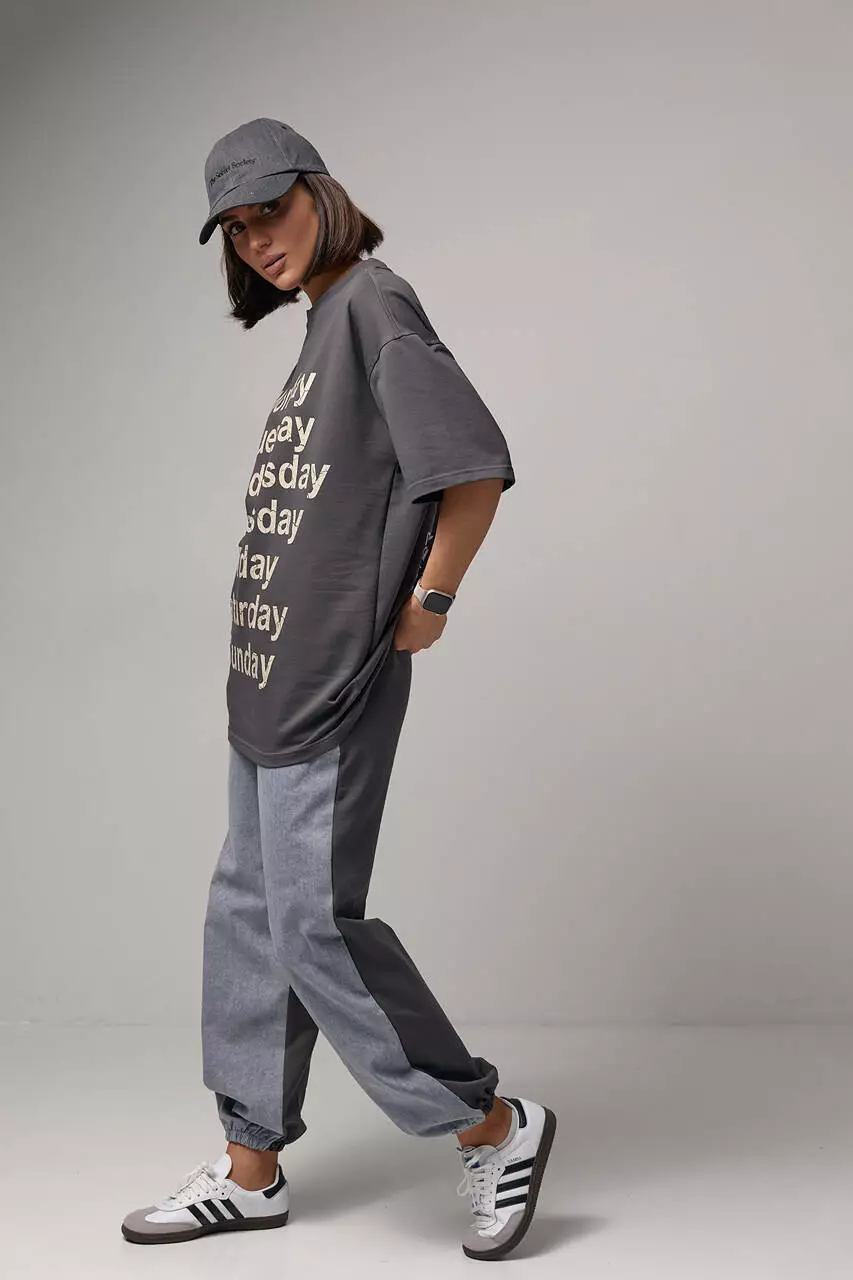 В комплекте штаны имеют комбинацию ткани - спереди они пошиты из демина, а сзади - из трикотажа. Втачной пояс идет на широкой резинке и дополнен завязками из шнурка. Спереди вверху вшиты удобные кармашки.