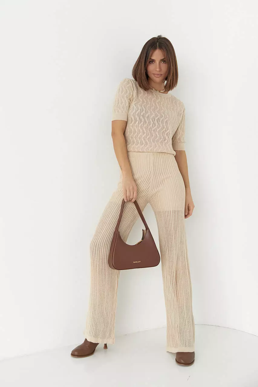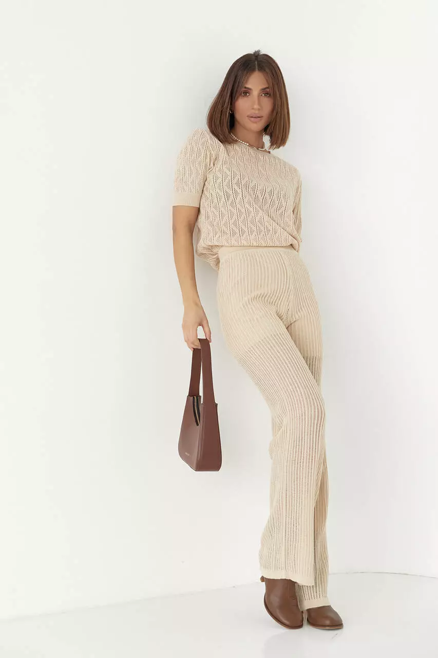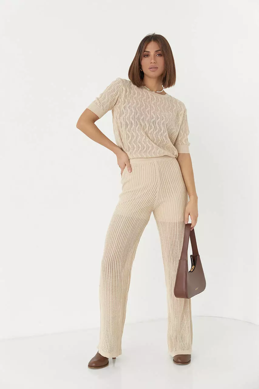 Создавать трендовые образы с максимальным комфортом в новом сезоне тебе поможет стильный брючный костюм с ажурной вязки.