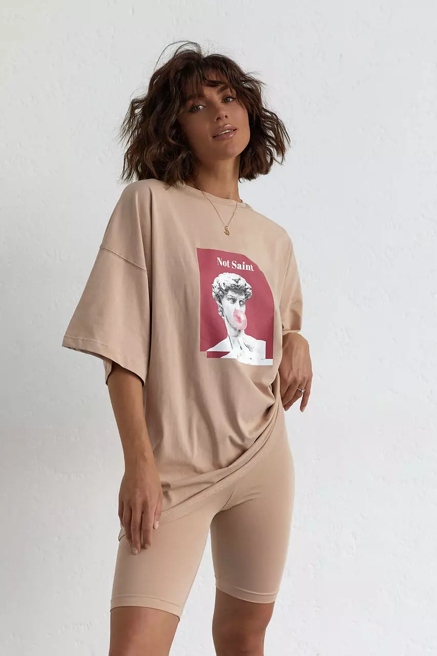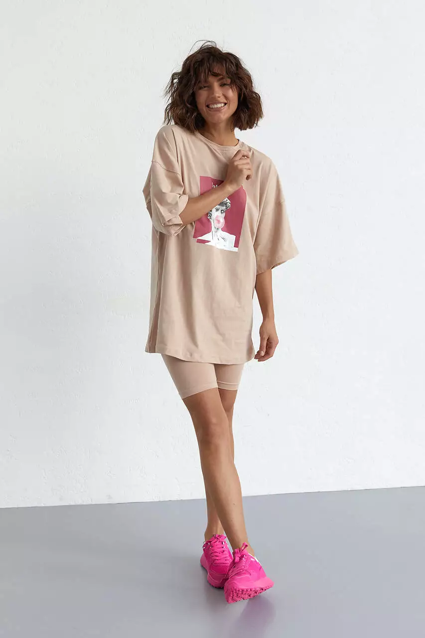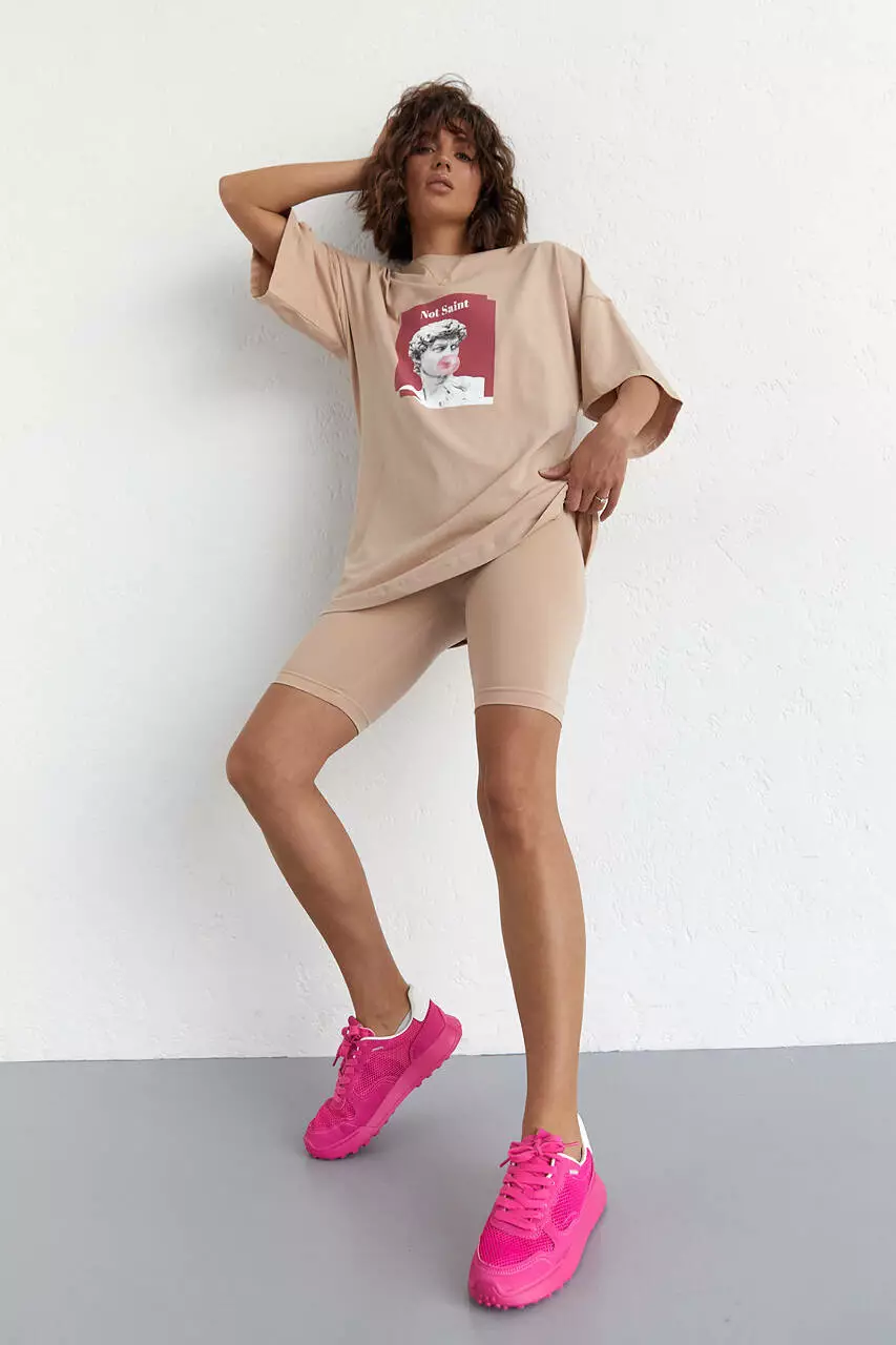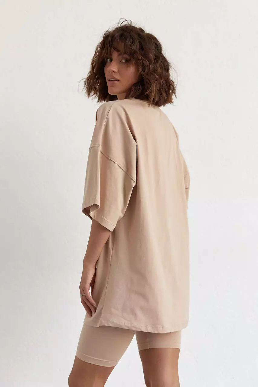 Женский костюм с футболкой oversize и велосипедками - кофейный цвет, L (есть размеры)