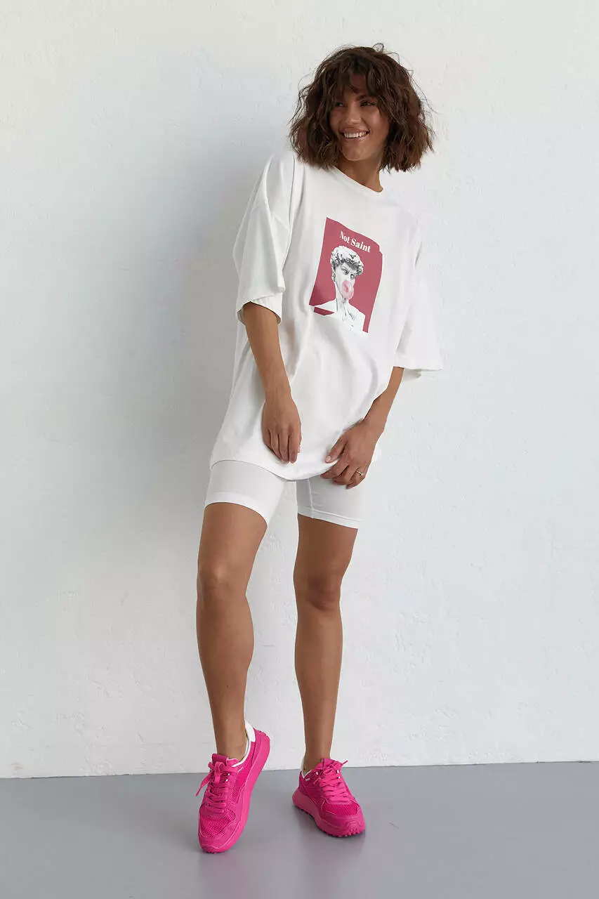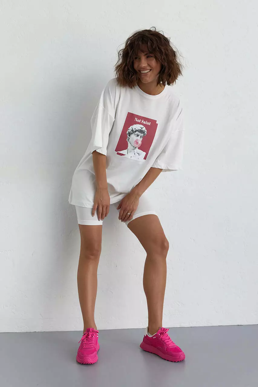 Женский костюм с футболкой oversize и велосипедками - молочный цвет, M (есть размеры)