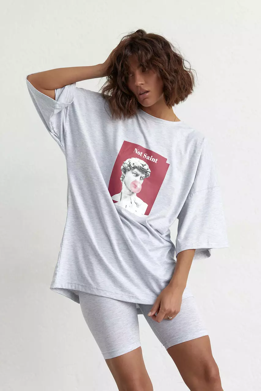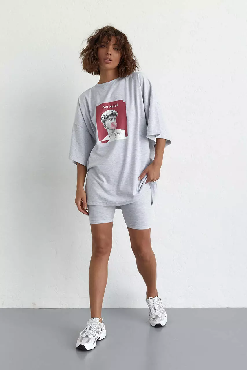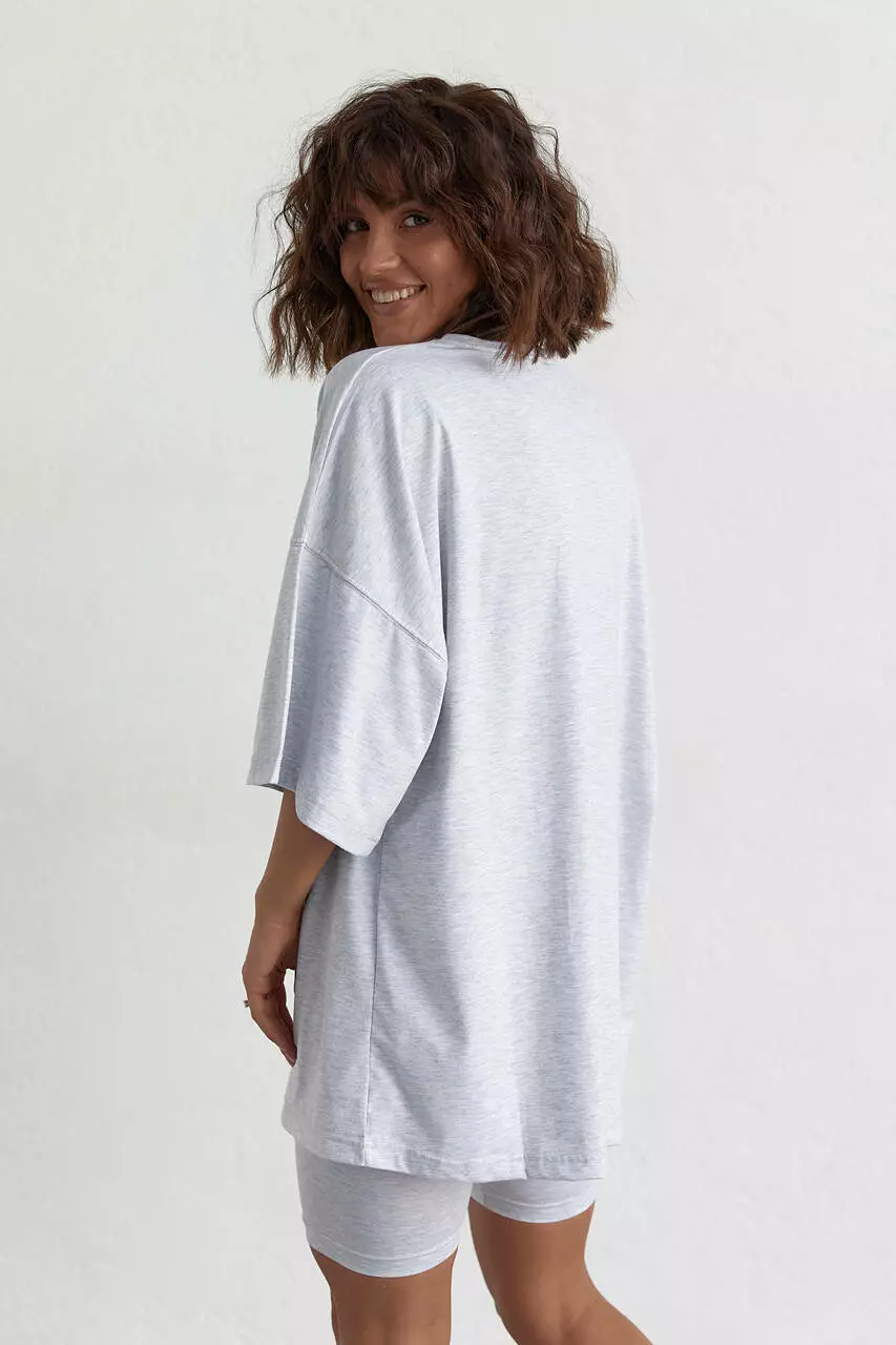 Женский костюм с футболкой oversize и велосипедками - светло-серый цвет, S (есть размеры)