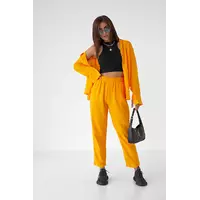 В комплекте свободные брюки с карманами и резинкой на поясе и рубашка классического фасона.
