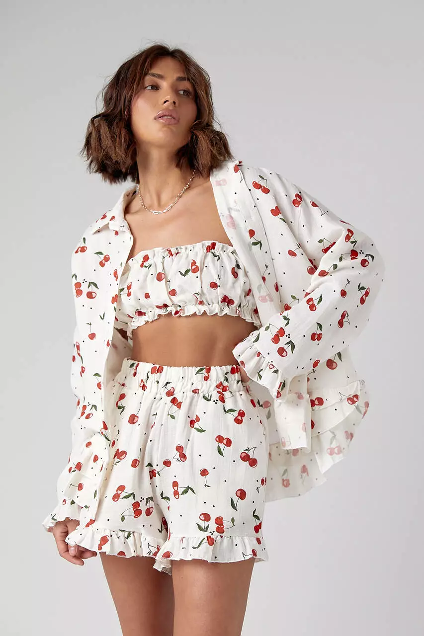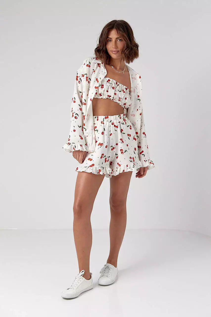 Летний женский костюм-тройка в пижамном стиле, украшенный