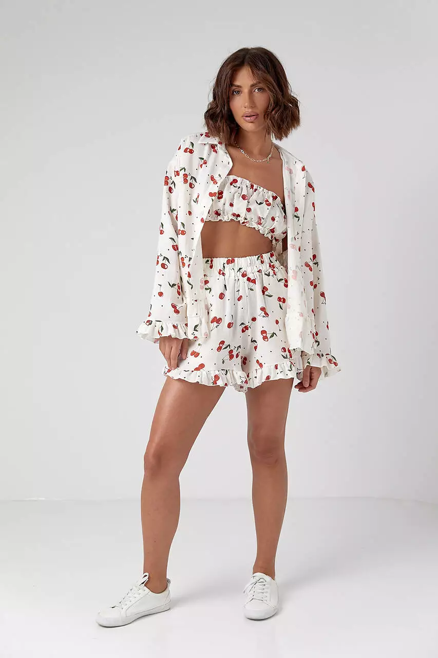 Летний женский костюм-тройка в пижамном стиле, украшенный