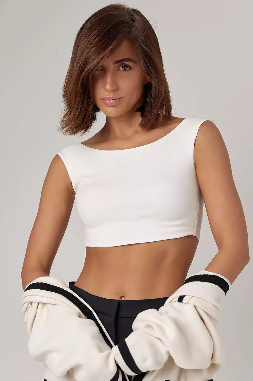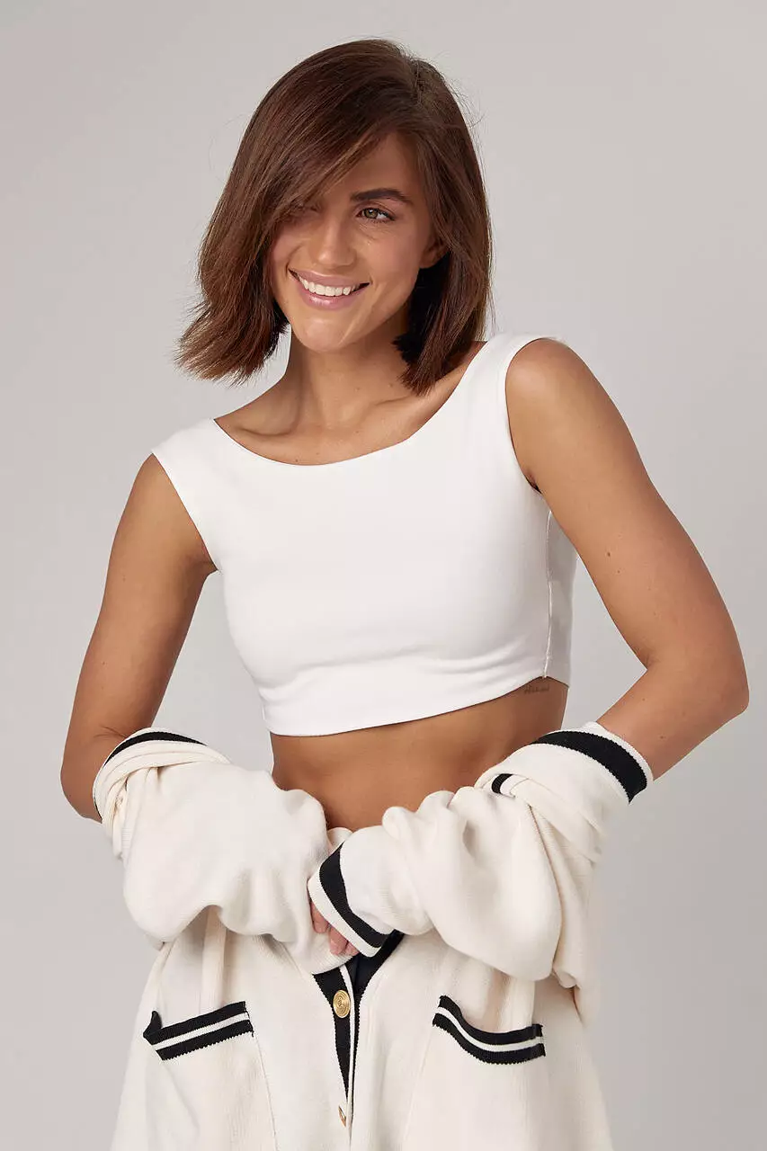 Кроп-топ выполнен из трикотажной ткани, которая отличается эластичностью и мягкостью.