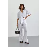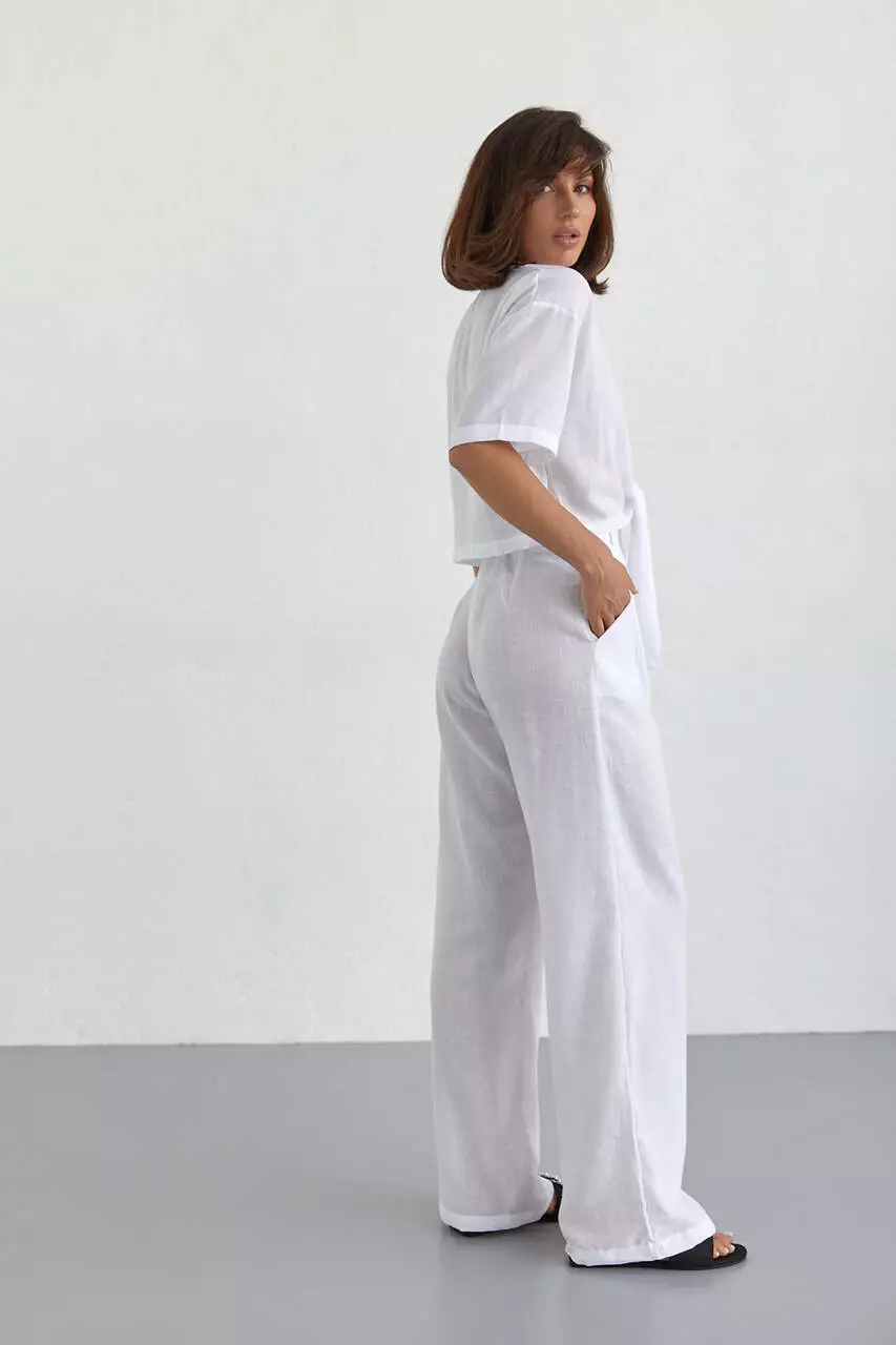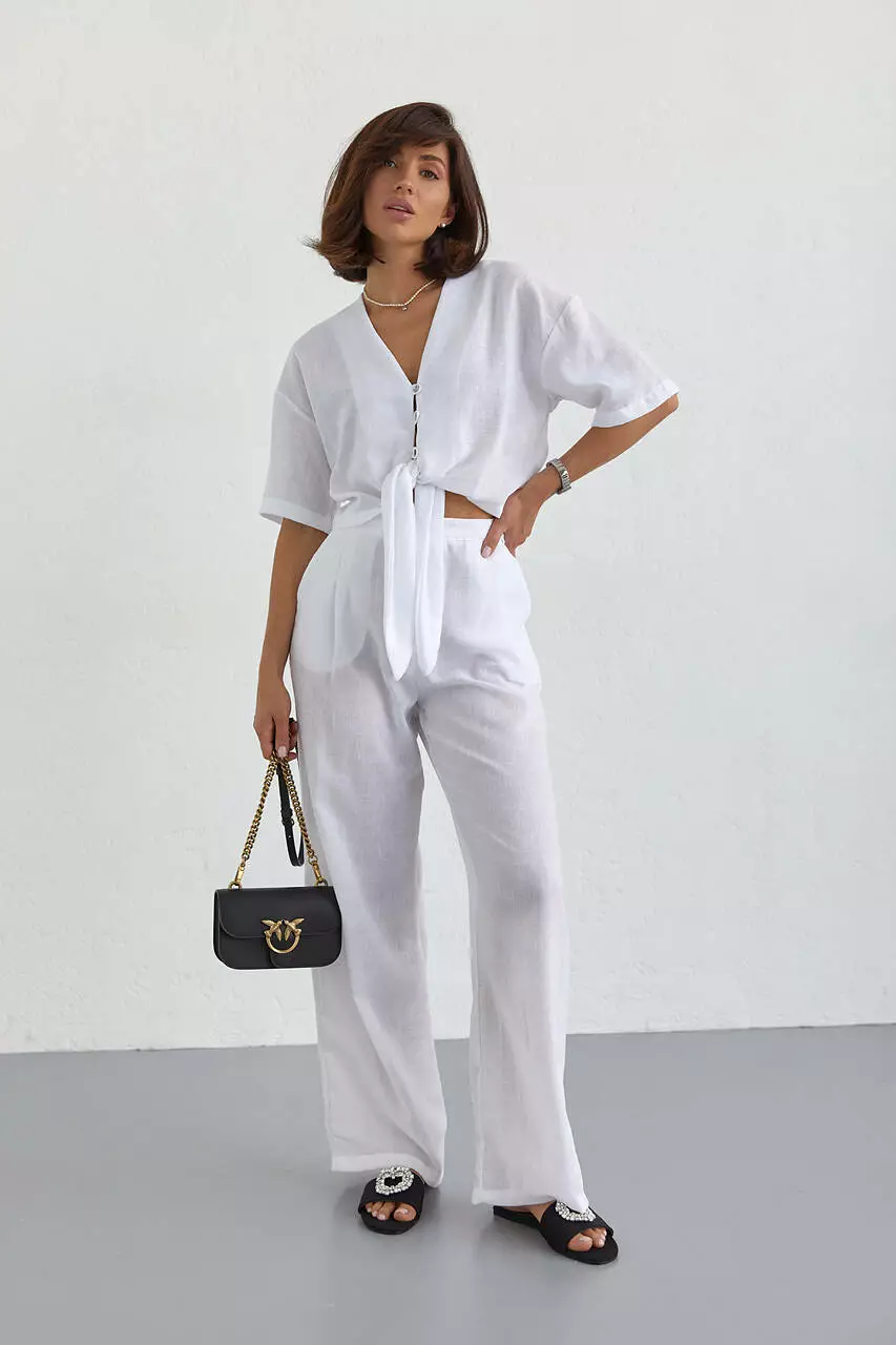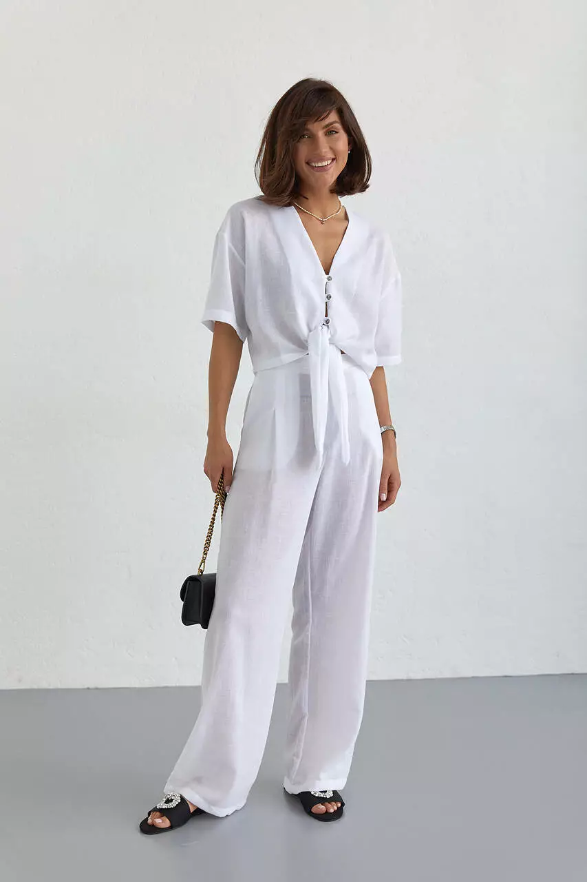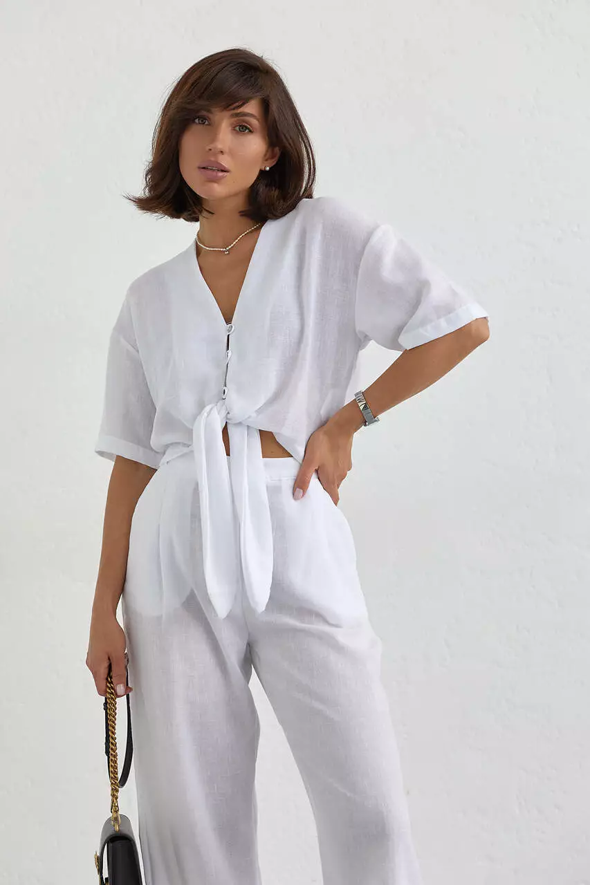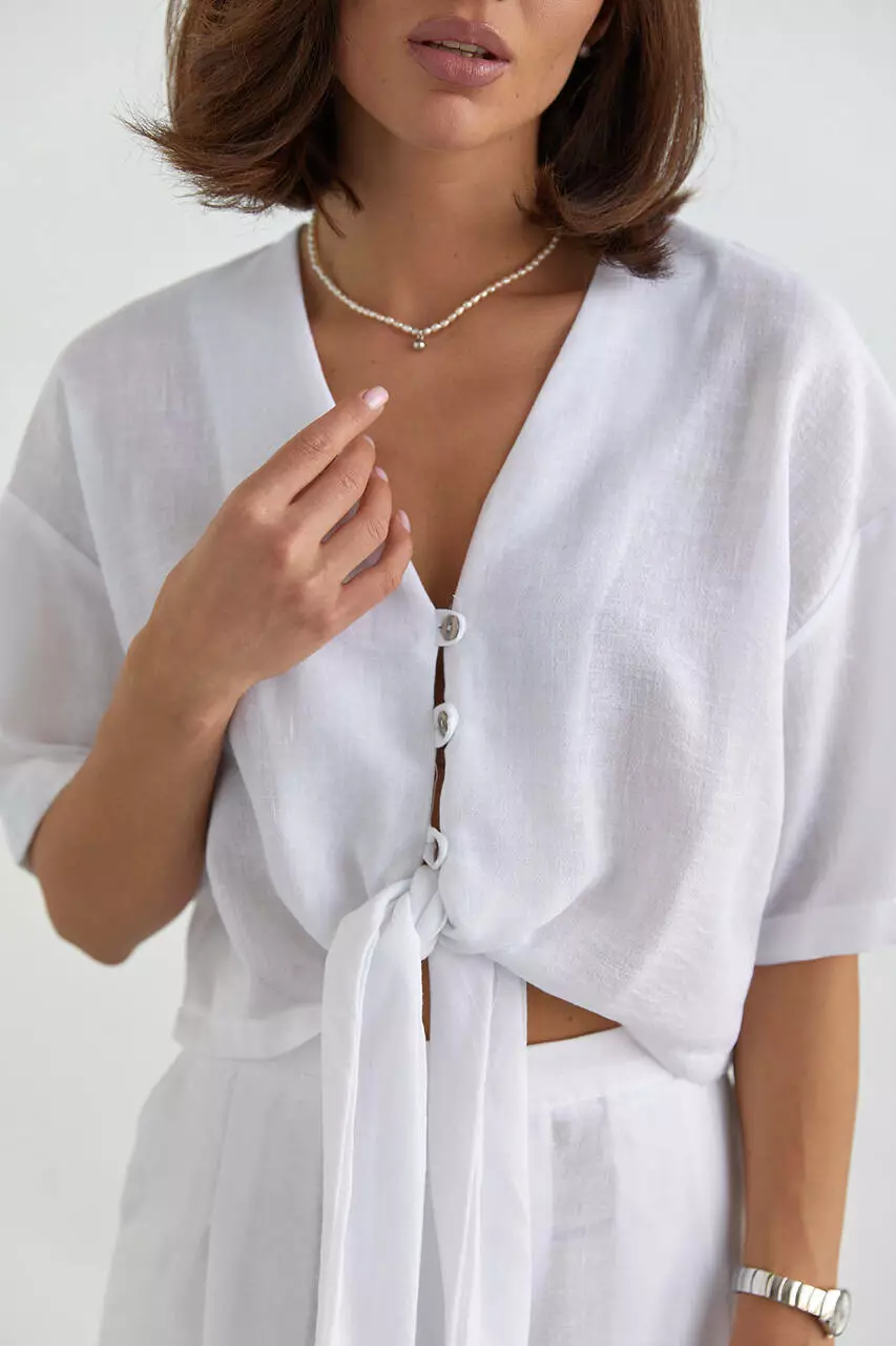 В комплекте идет укороченная блуза с короткими рукавами. Края прямого низа спереди дополнены завязками.