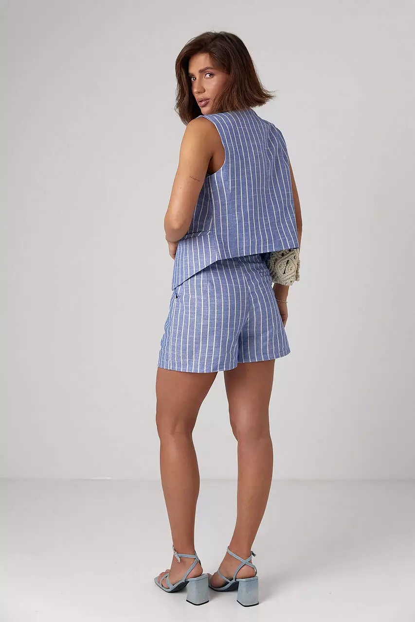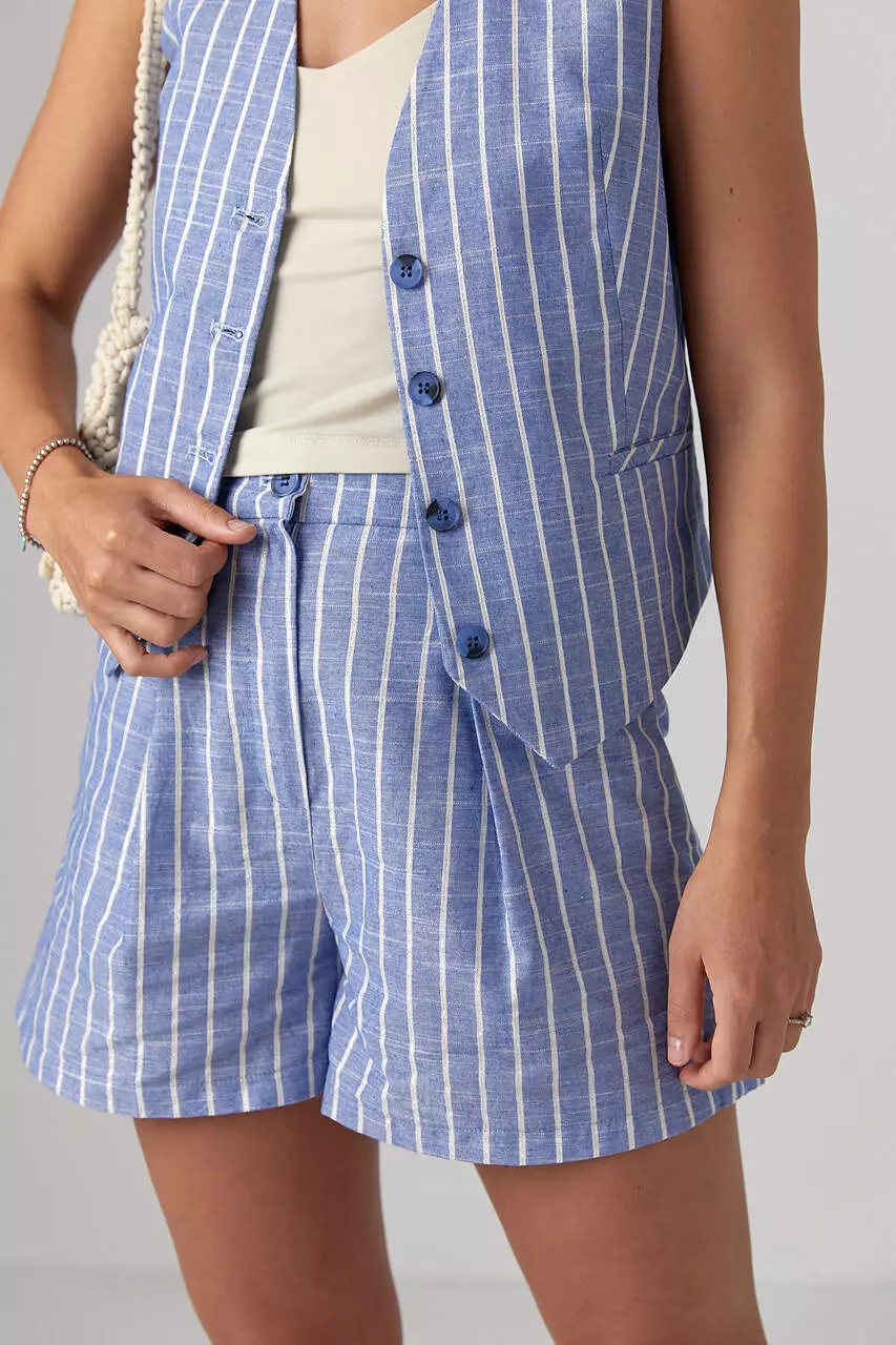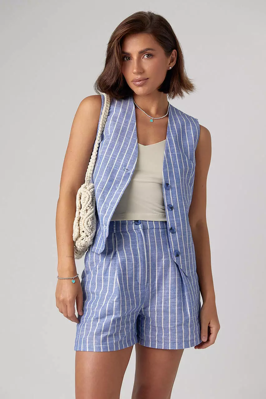 Этот женский костюм с шортами и жилетом в полоску ты можешь дополнять базовой футболкой для создания летних рабочих образов, или носить его как готовый look в трендовом уличном стиле.