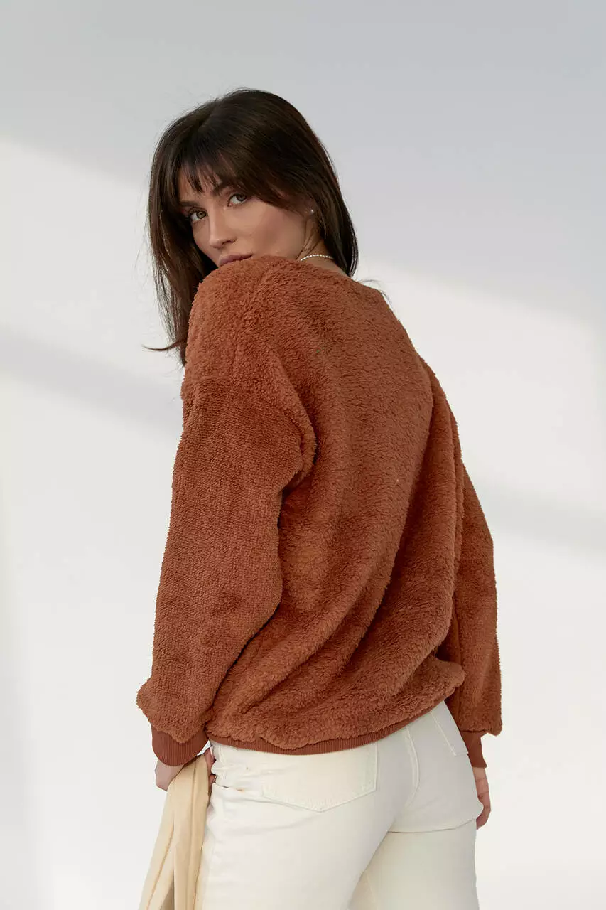 Теплый молодежный свитшот, сшитый из теплого, искусственного меха Тедди, который имеет приятную на ощупь фактуру и мягкую текстуру. Подарит тебе множество стильных и уютных дней в новом сезоне. Это прекрасное дополнение и к любимым джинсам, и к утепленным женским джоггерам.