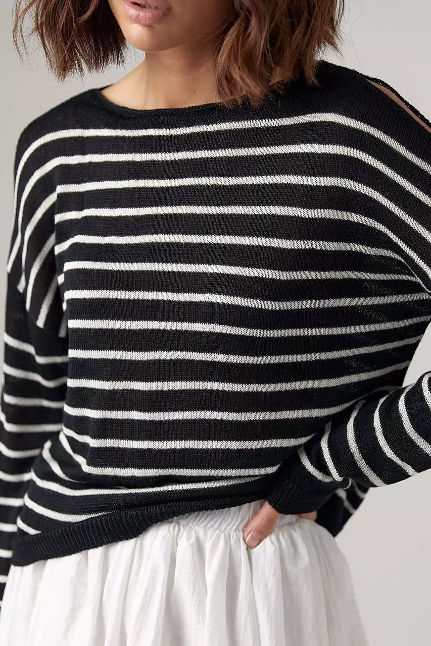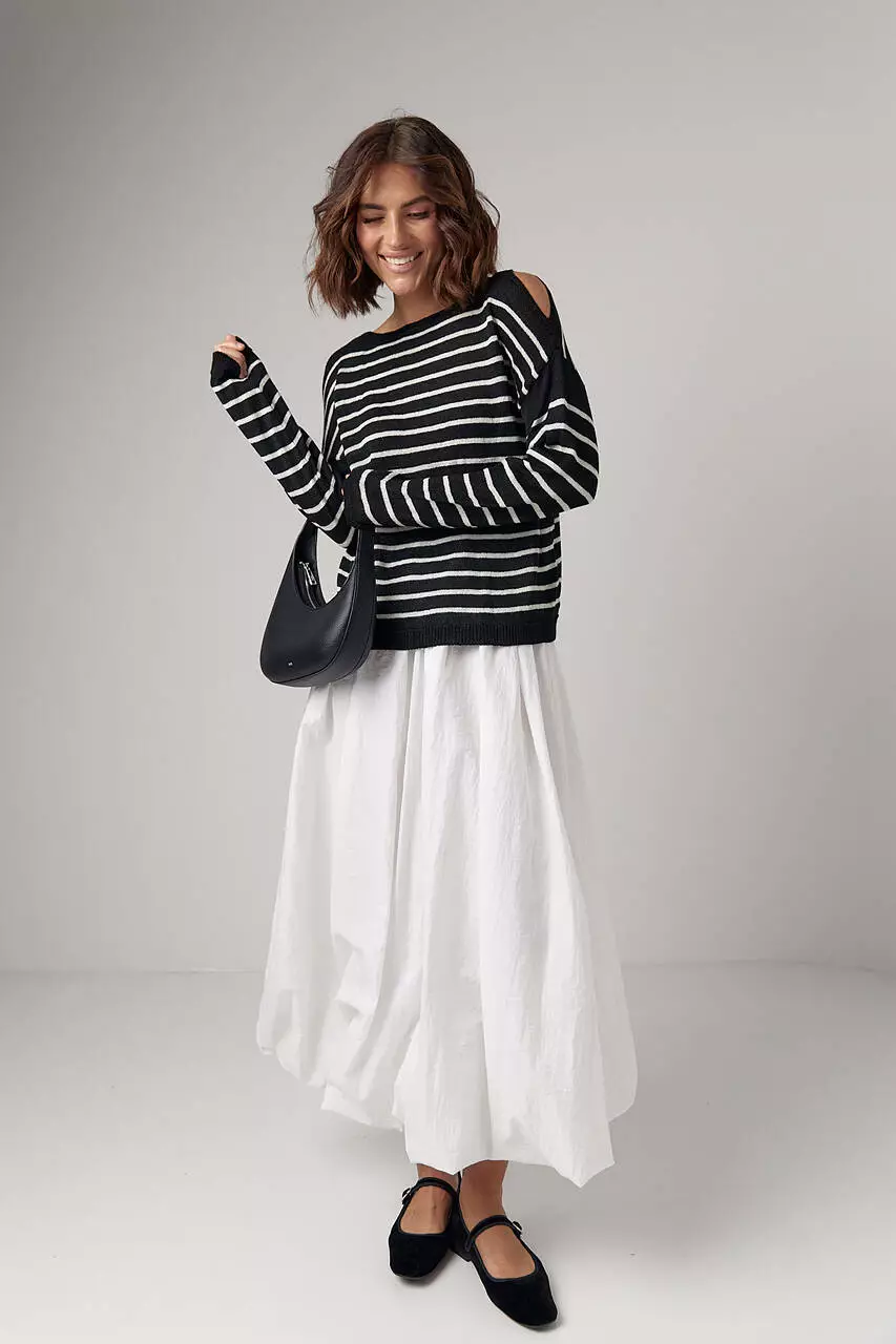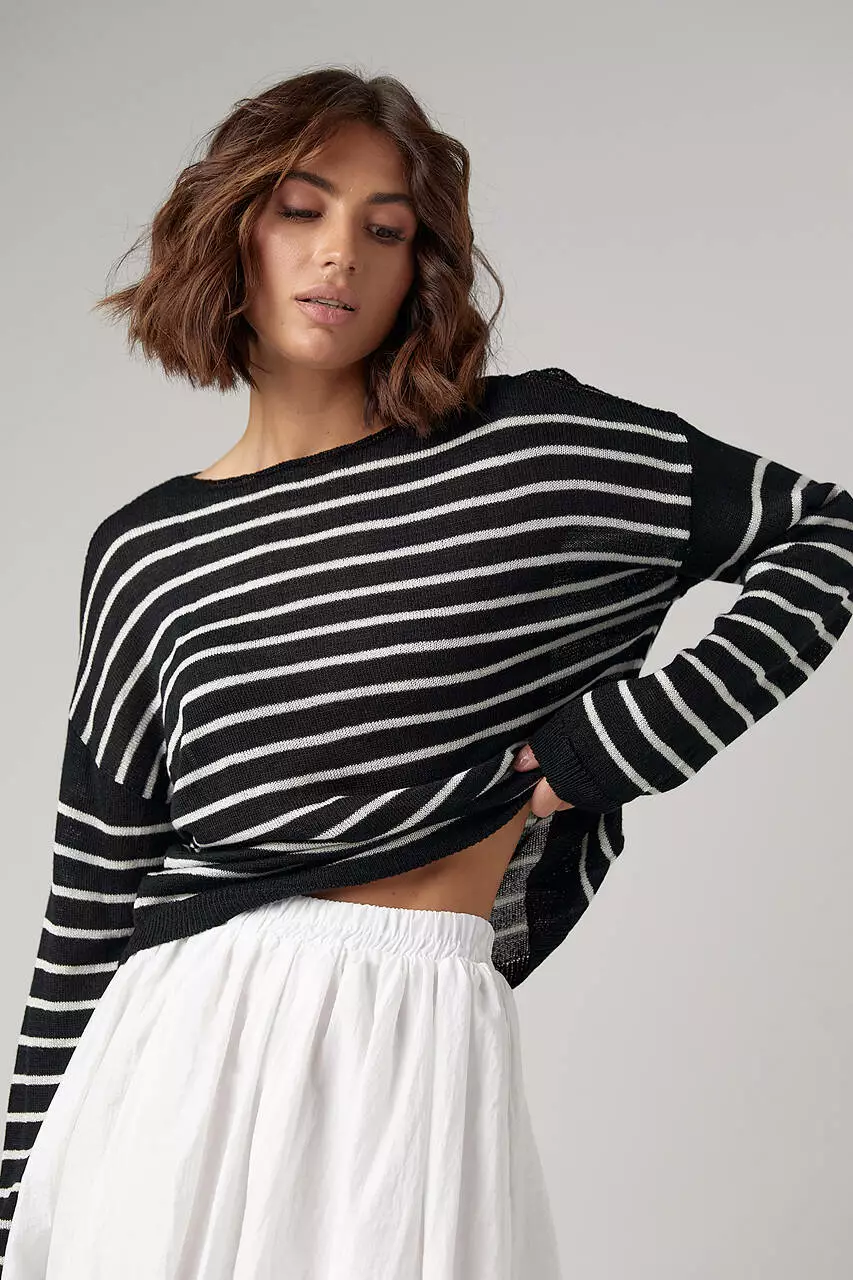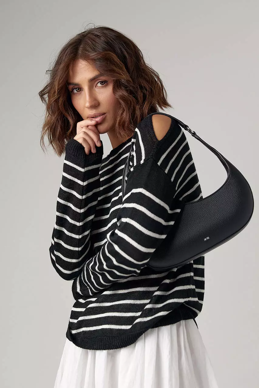 Модель в стиле оверсайз идет с горловиной-лодочкой, края которой