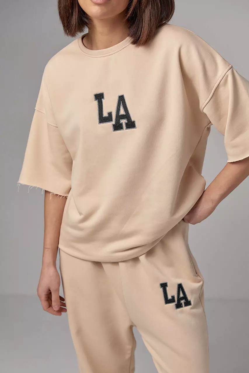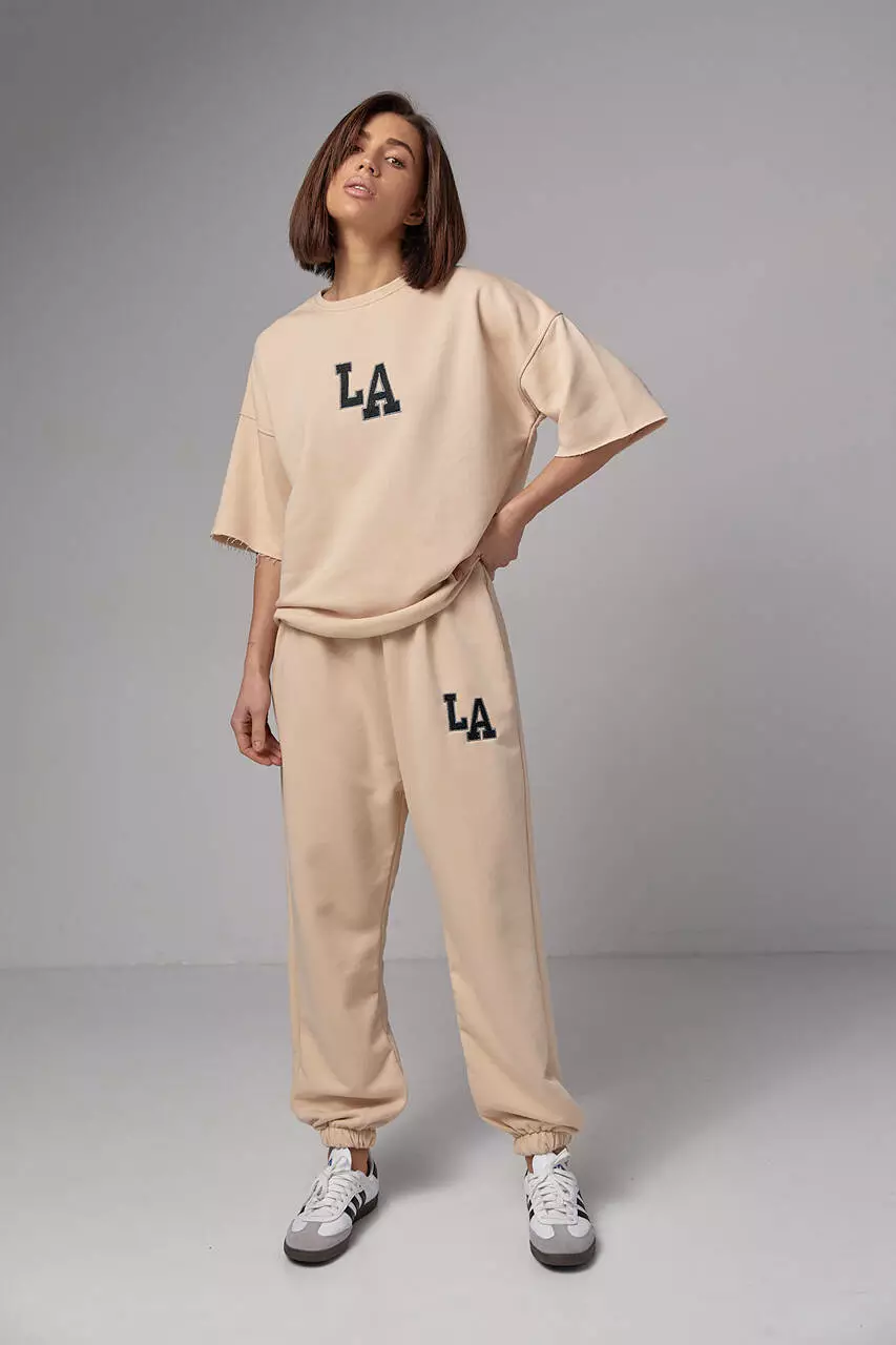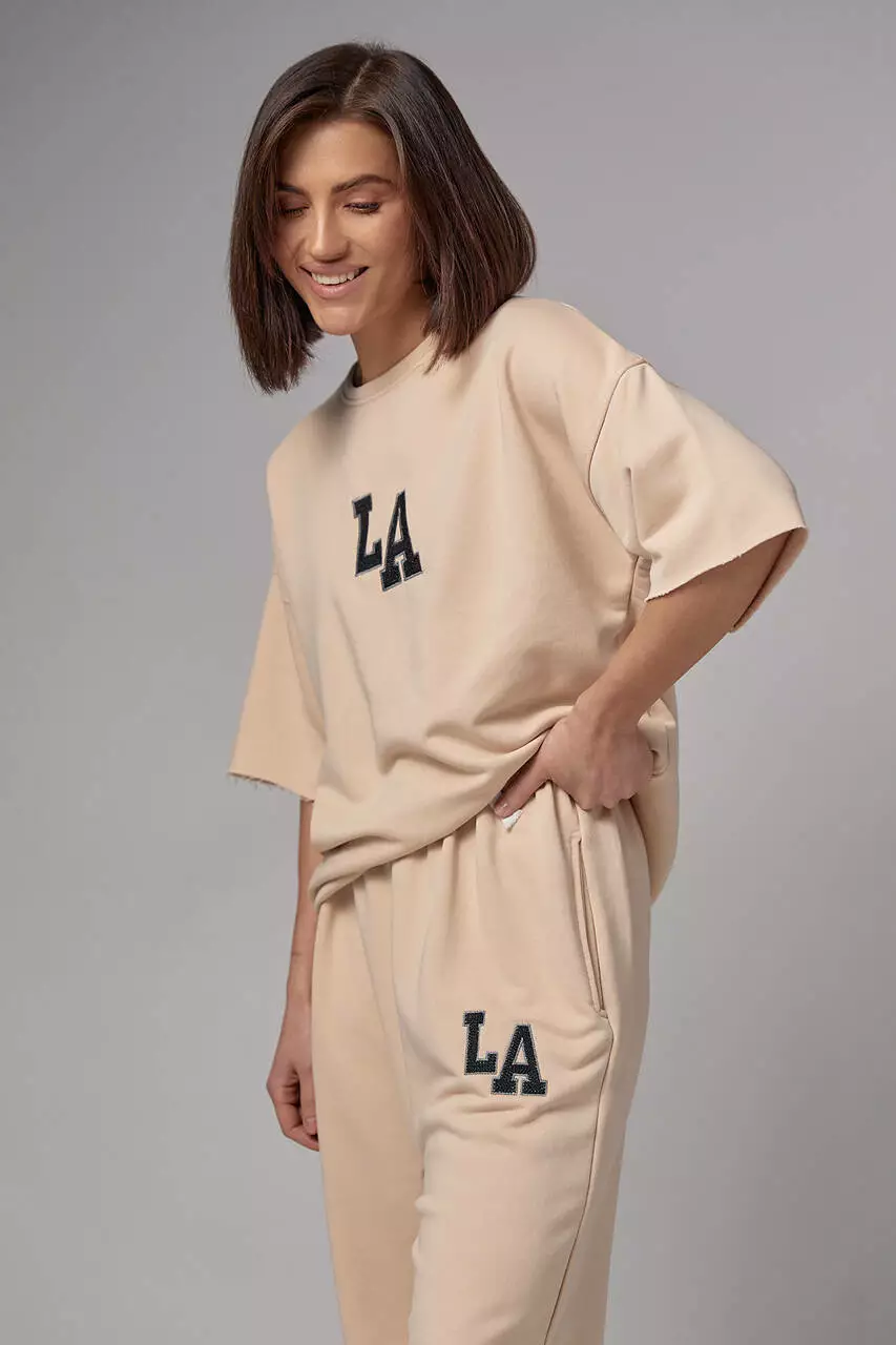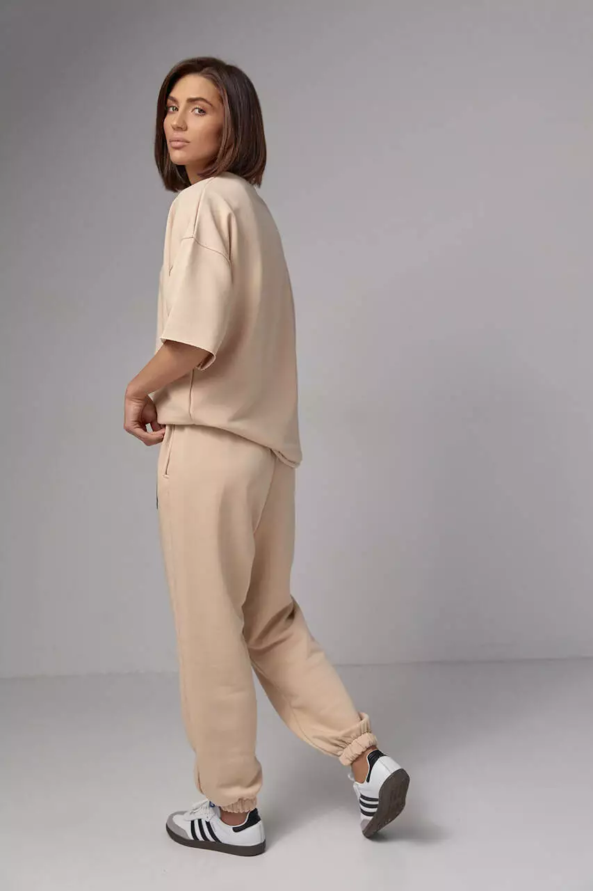 штаны-джоггеры. В футболке прямой крой, рукава и низ имеют
