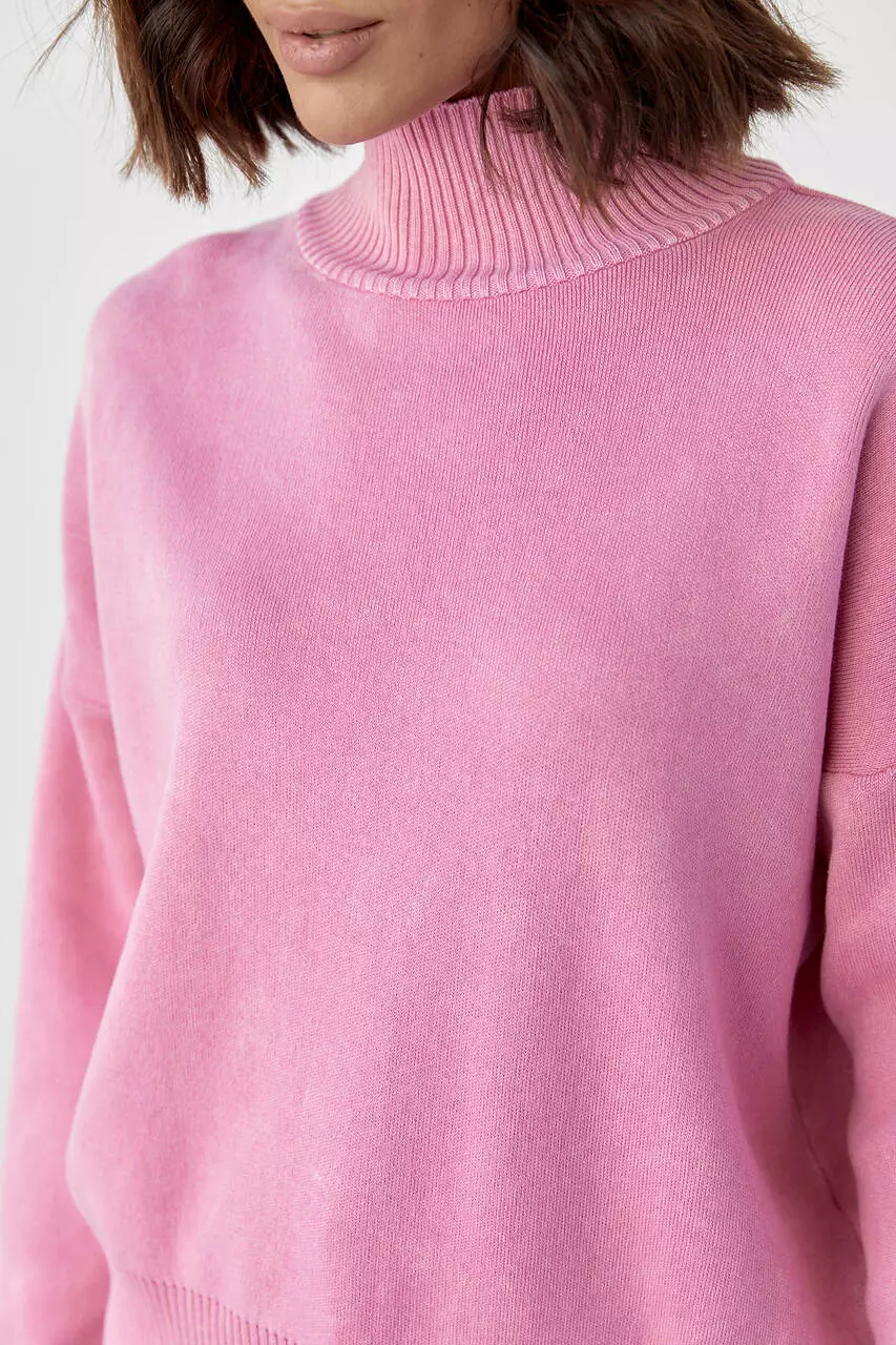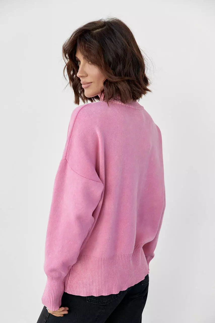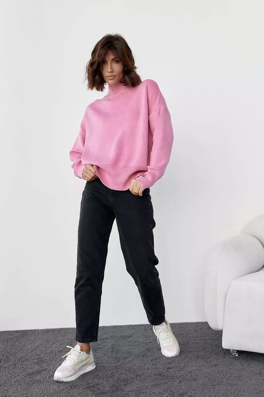 В изделии линия плеча опущена, прямой низ и длинные рукава заканчиваются вязаными манжетами.