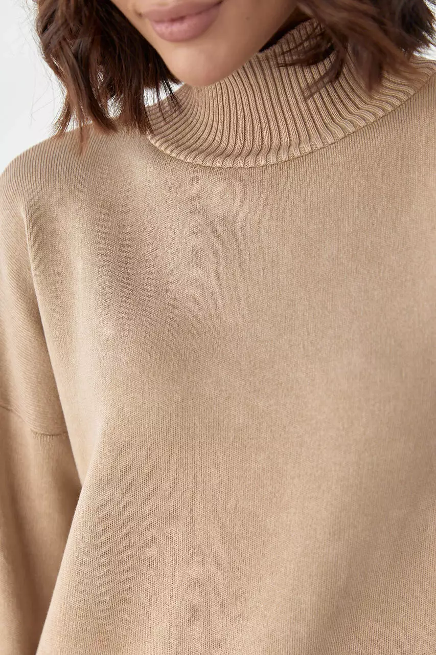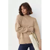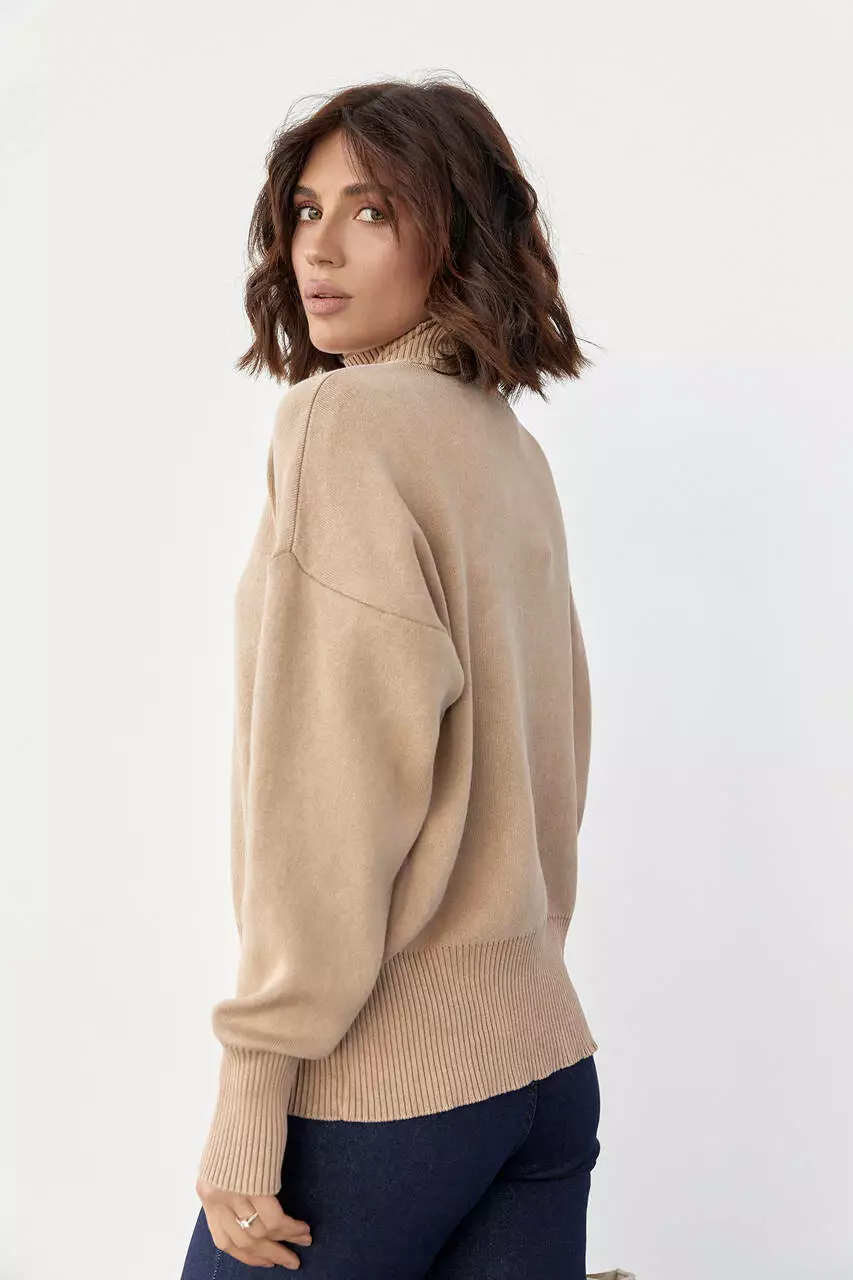 В изделии линия плеча опущена, прямой низ и длинные рукава заканчиваются вязаными манжетами.