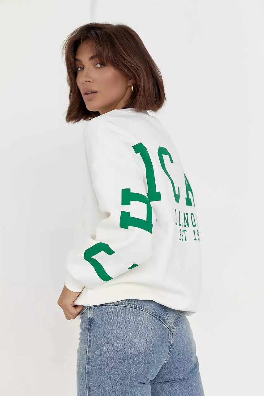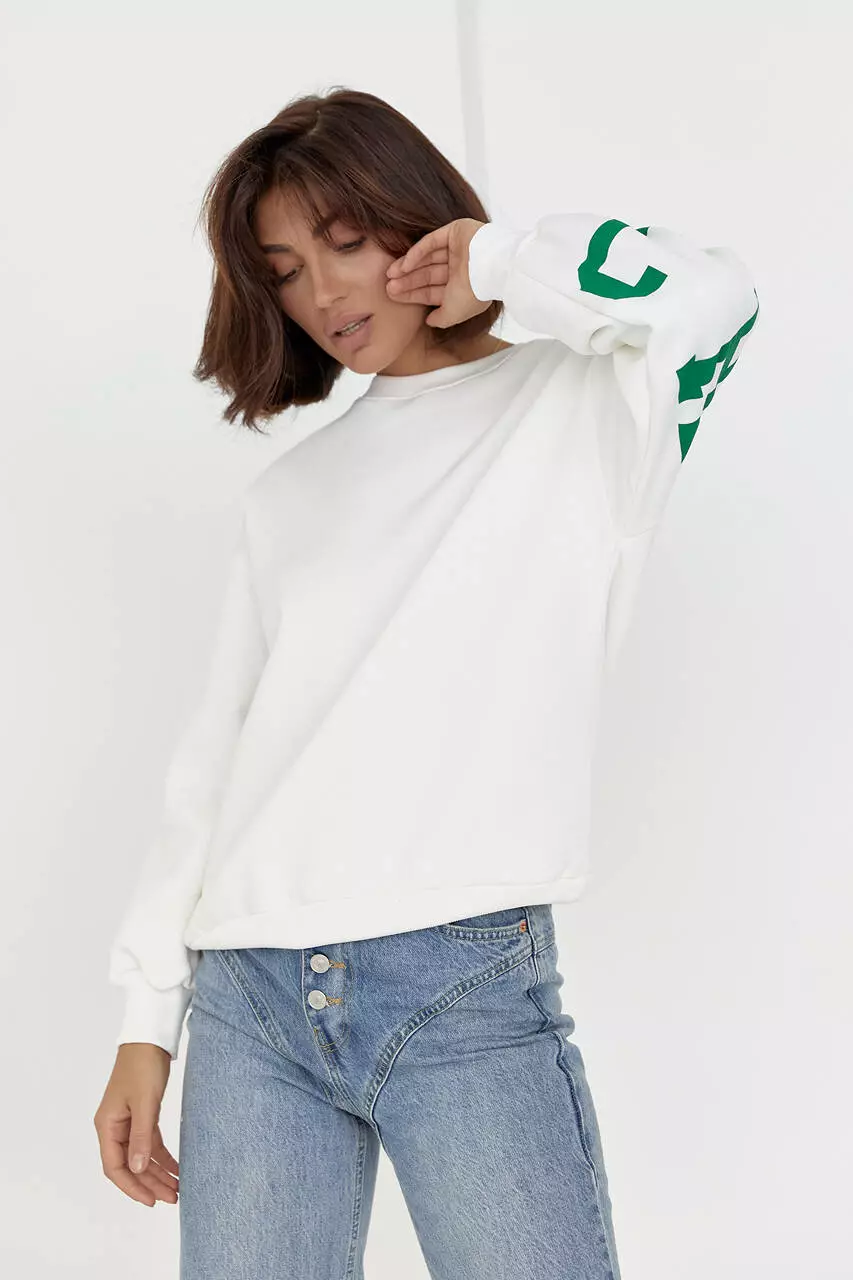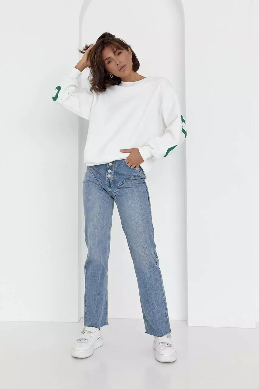 Горловина в изделие дополнена окантовкой, а прямой низ и длинные рукава заканчиваются манжетами в тон.