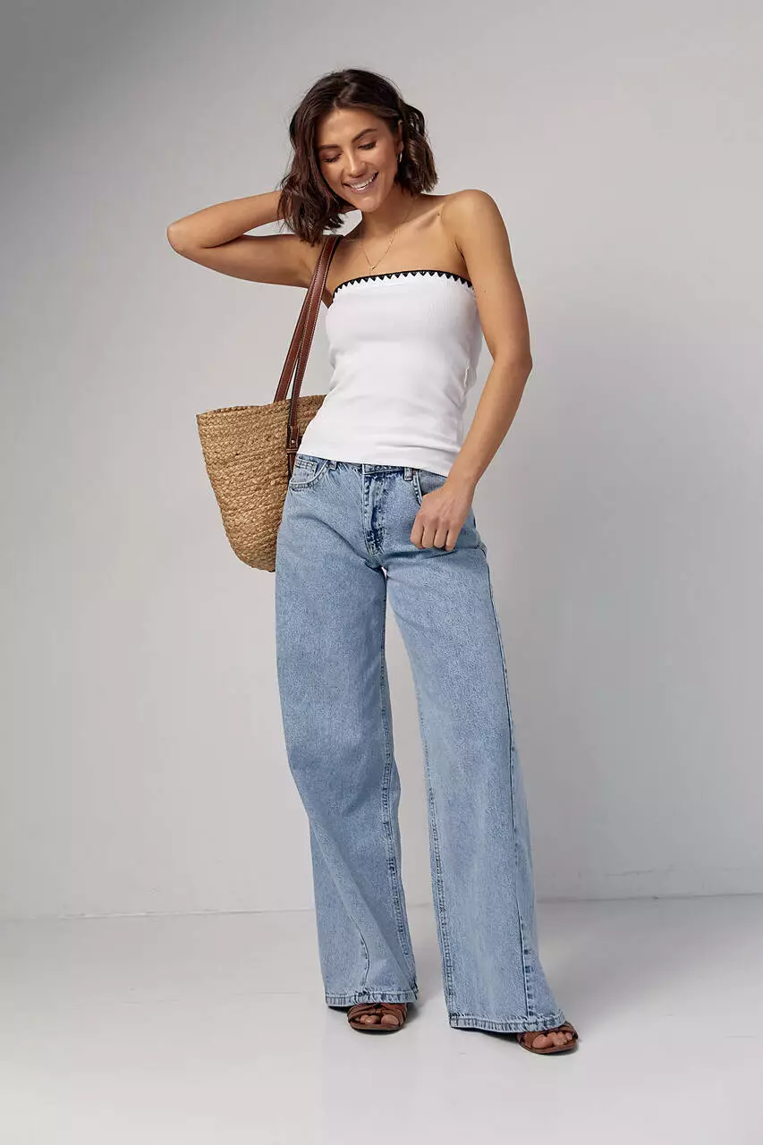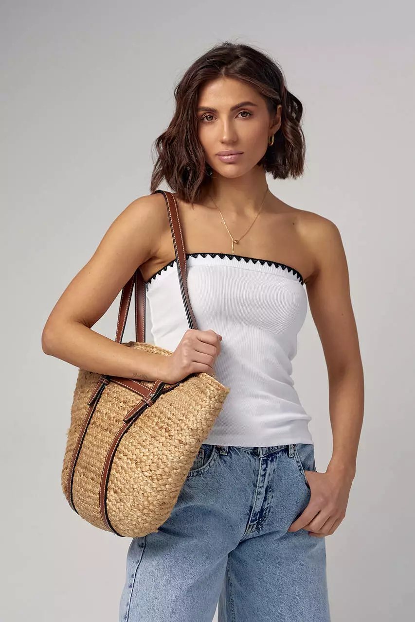 Модель отлично садится по фигуре благодаря эластичному материалу в рубчик. Верх топа дополнен окантовкой с основной ткани, которая имеет вышивку зигзаг.