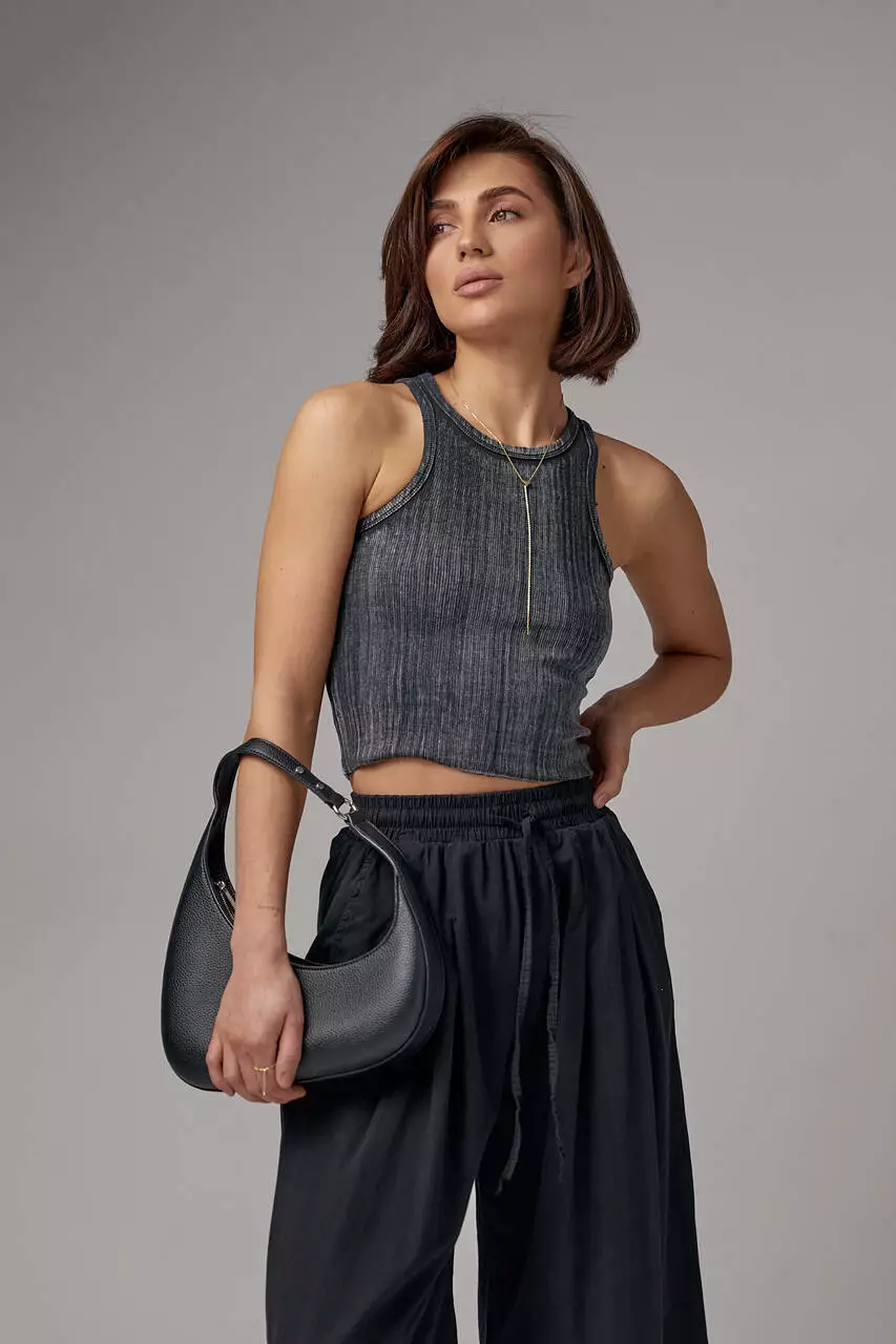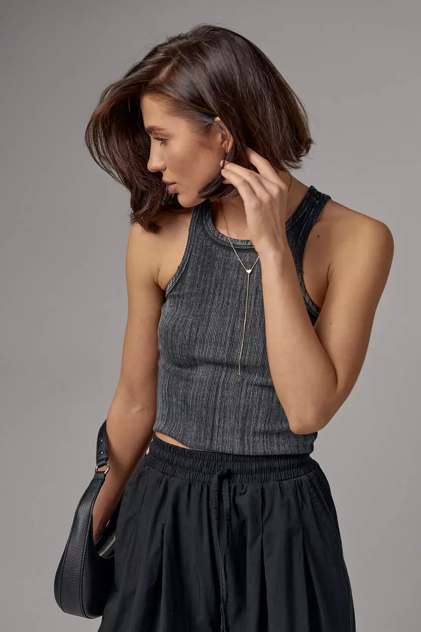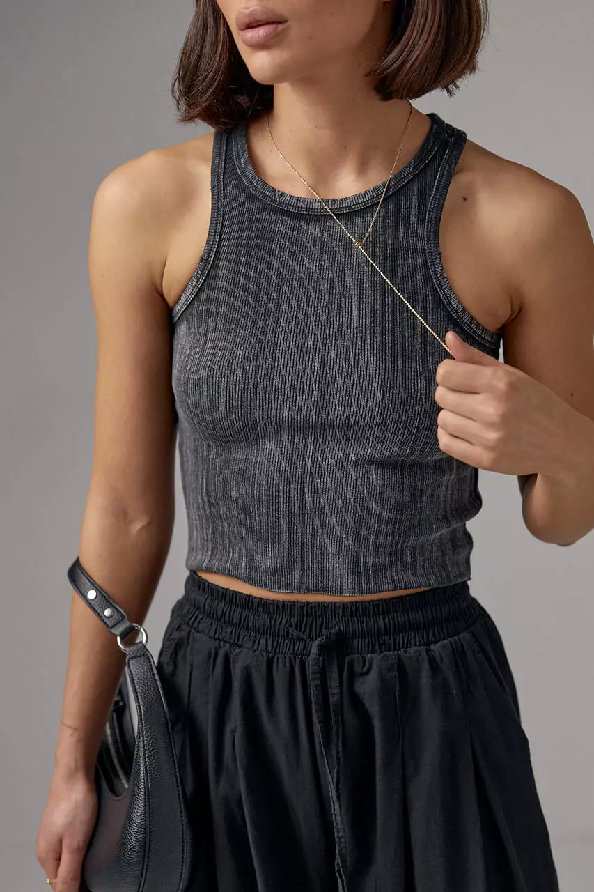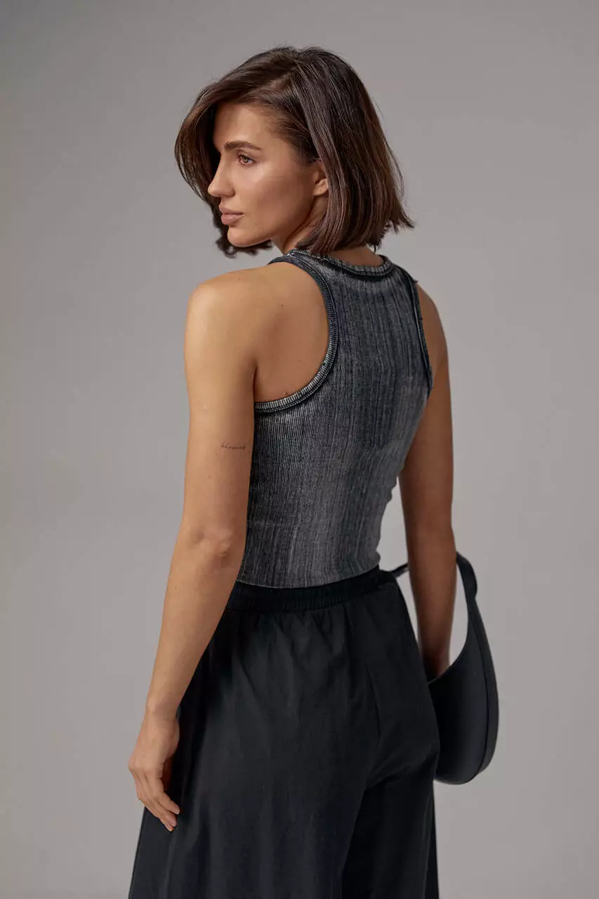 Эта майка имеет необработанный низ, что добавляет ей особенный шарм и непринужденный вид. Окантовка на проймах и горловине придает изделию аккуратный и завершенный вид.