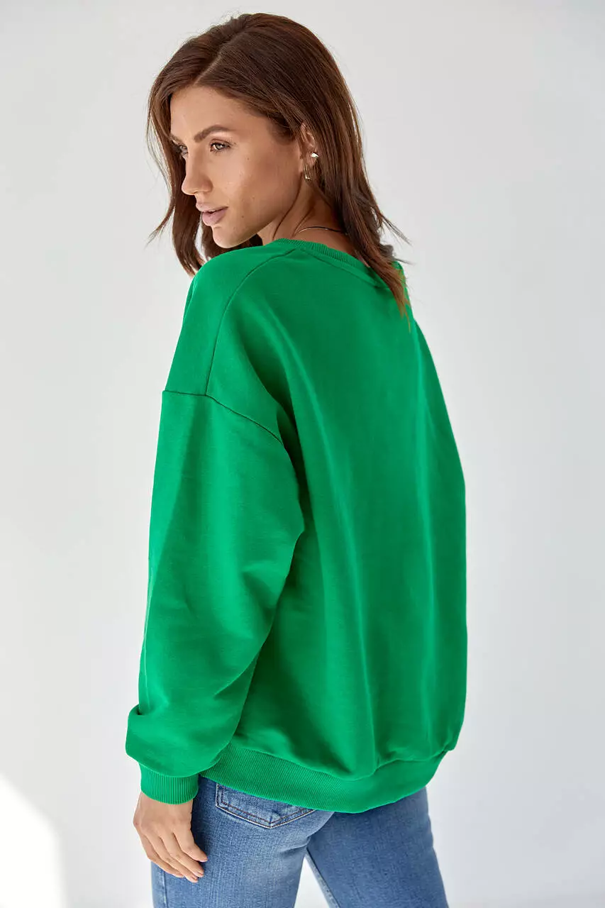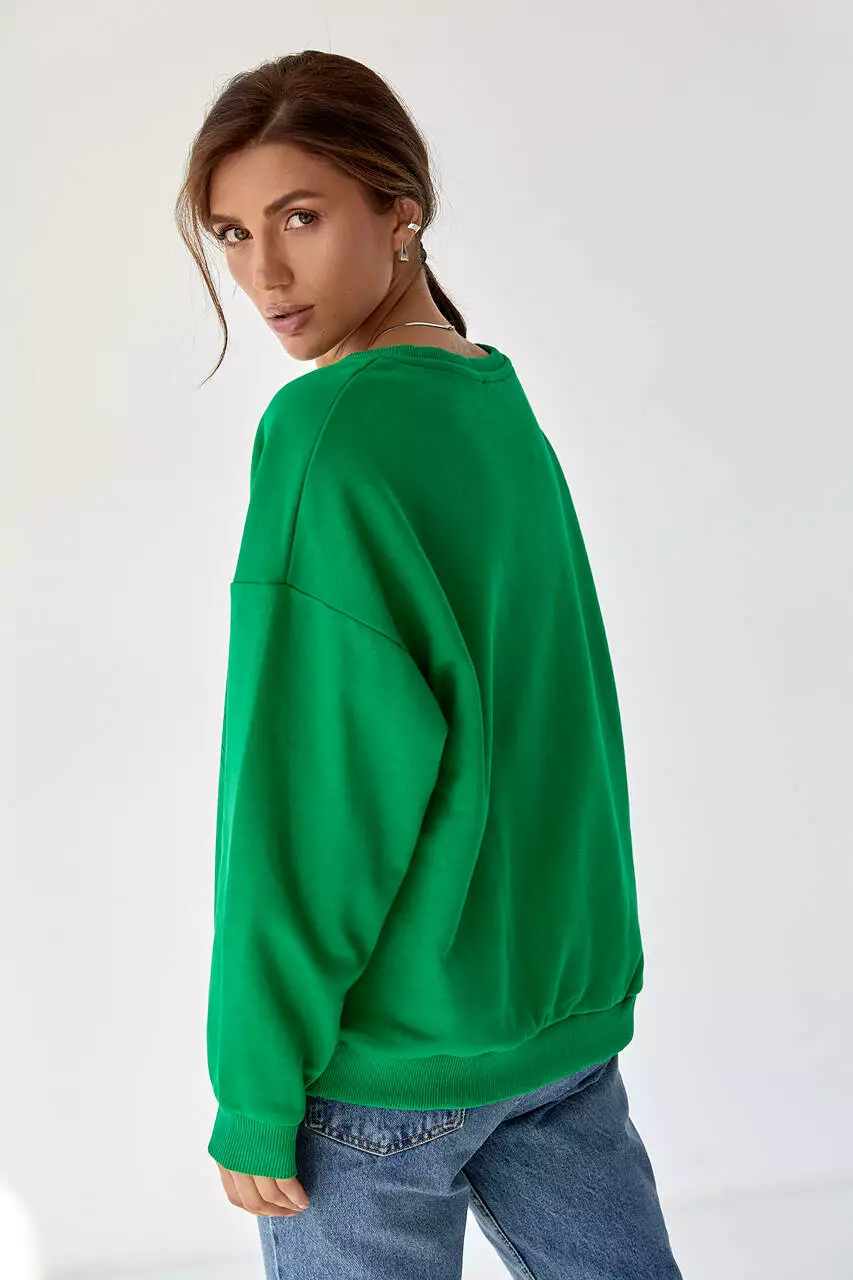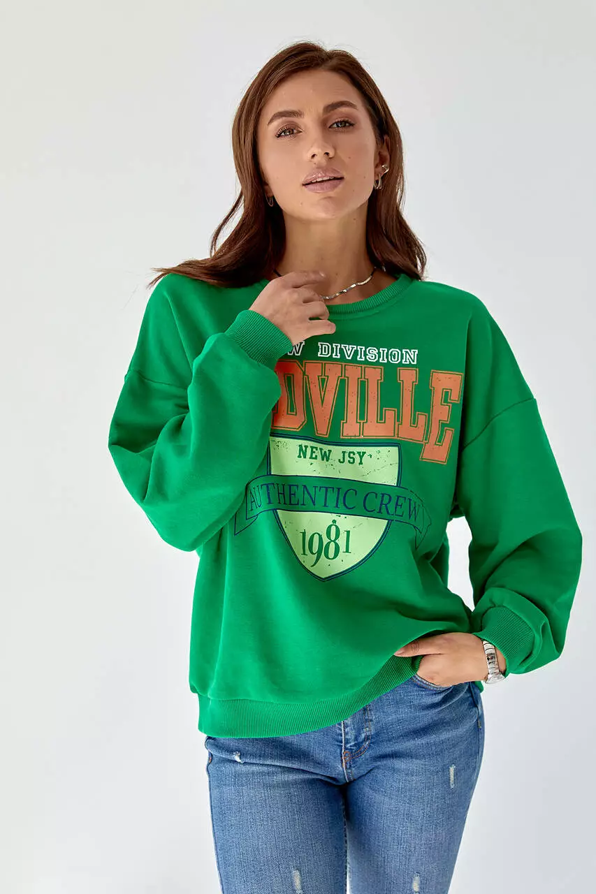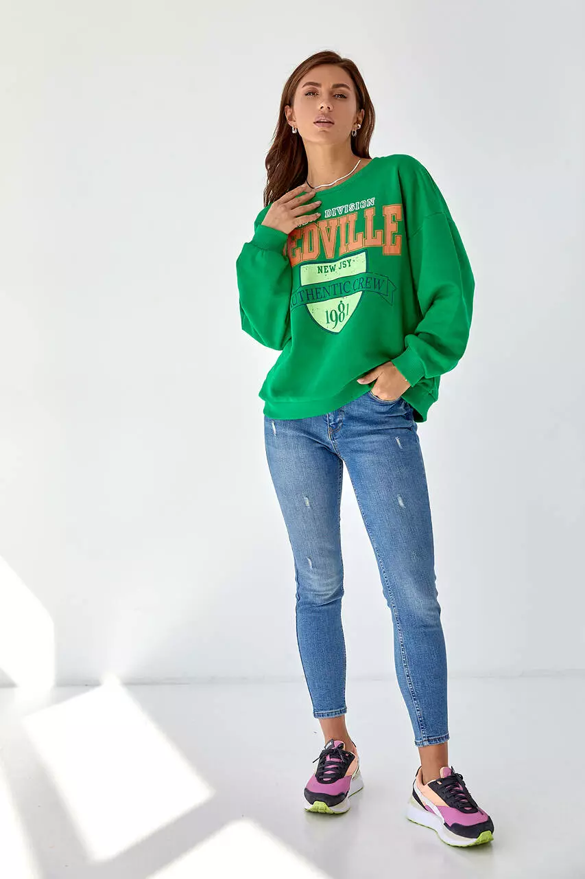 В этой модели спереди нанесен принтованая надпись с эффектом потертости. Сам свитшот идет с прямым низом, круглой горловиной с окантовкой и опущенными проймами. Длинные рукава и подол обшиты трикотажными манжетами.