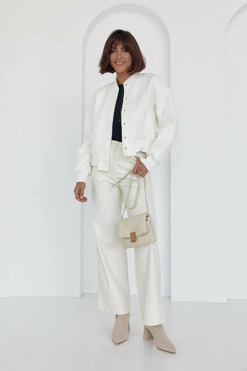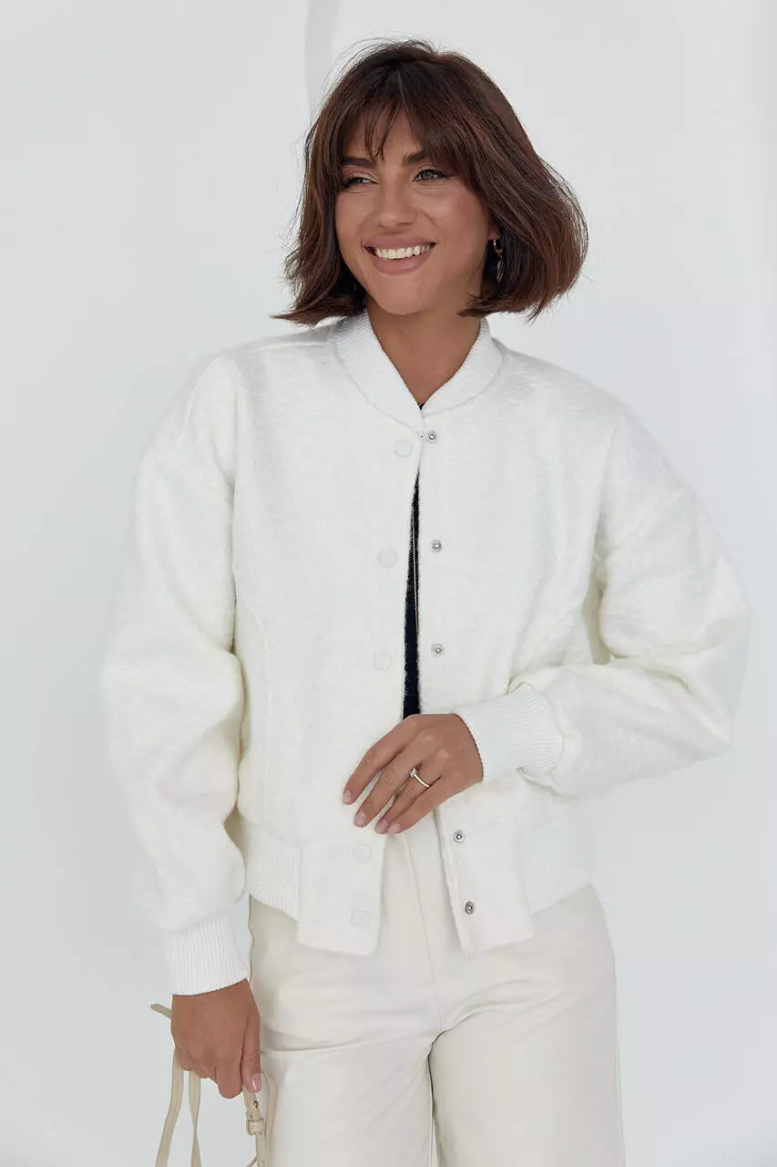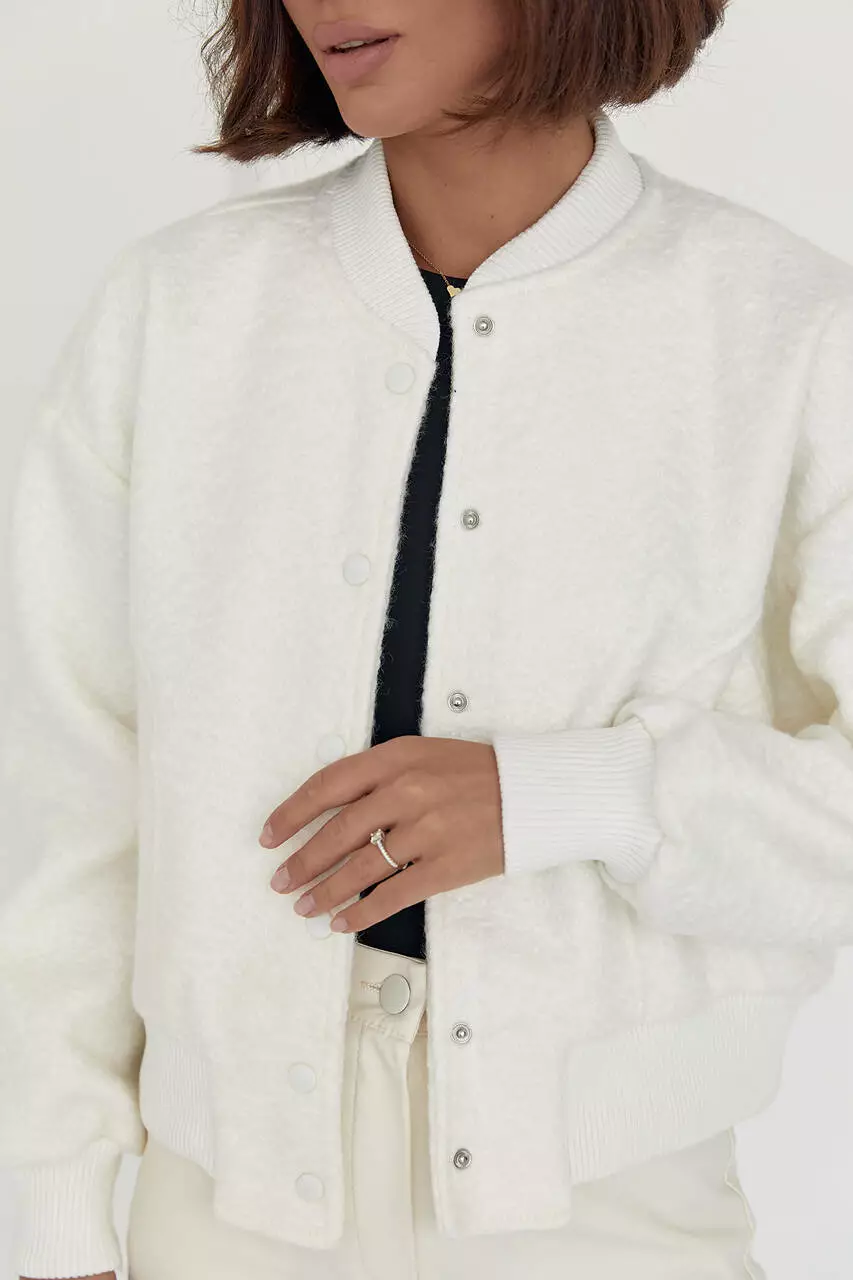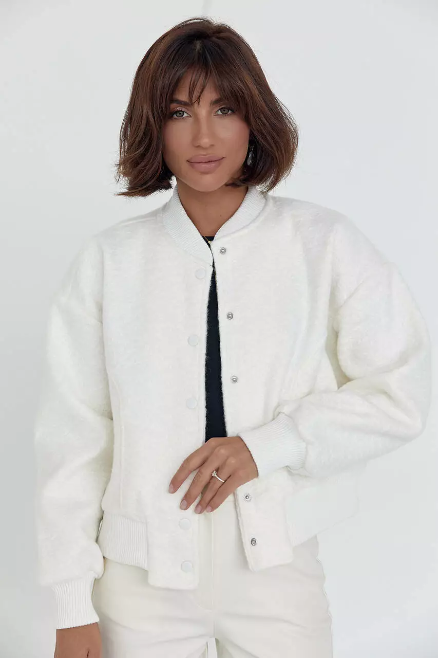 В модели прямой низ и длинные рукава дополнены манжетами из трикотажа в рубчик. Также в бомбер есть небольшой воротничок-стойка.