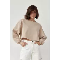 Модель выполнена из трикотажа 2-нитки с начесом. Проймы опущены, длинные рукава заканчиваются манжетами из рибаны.