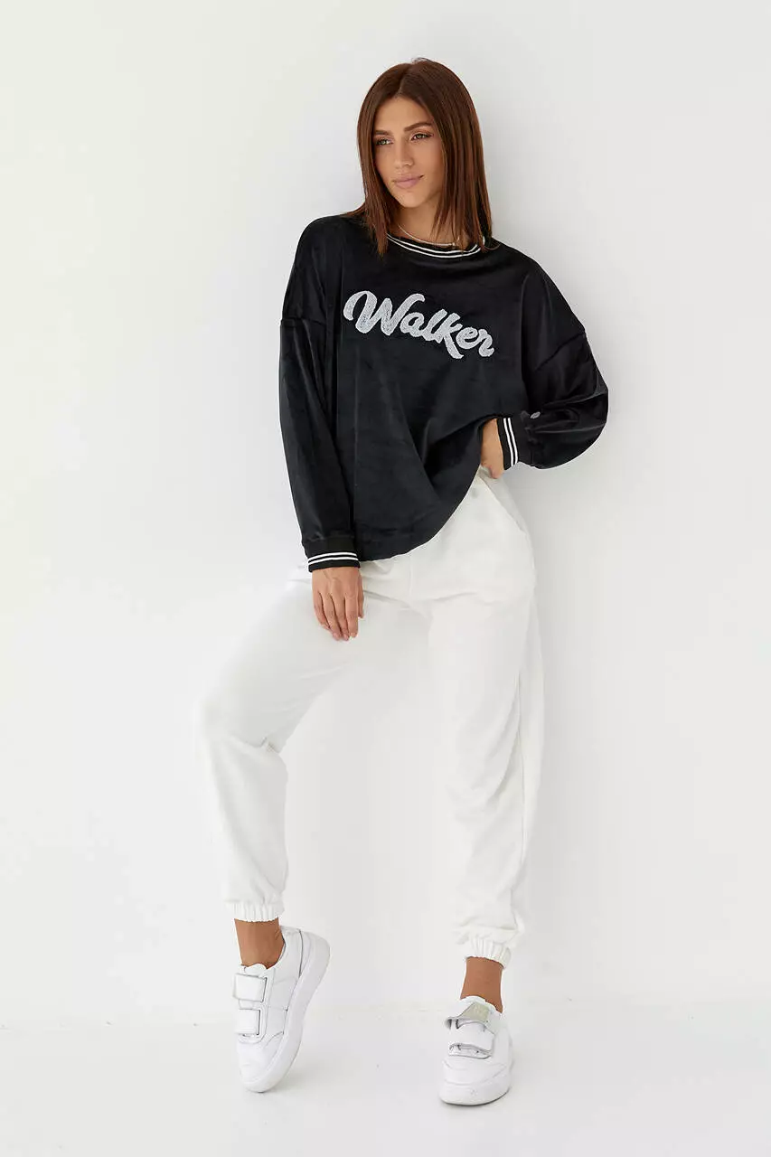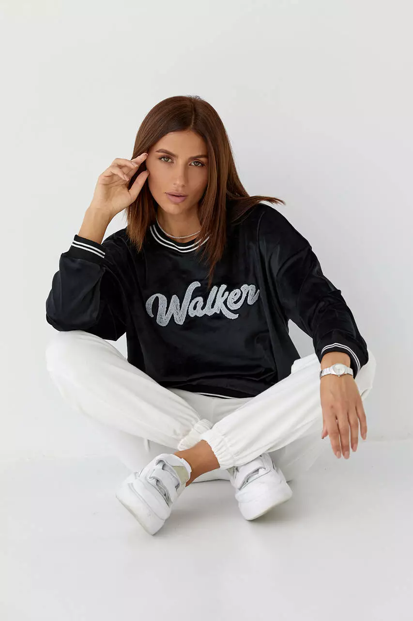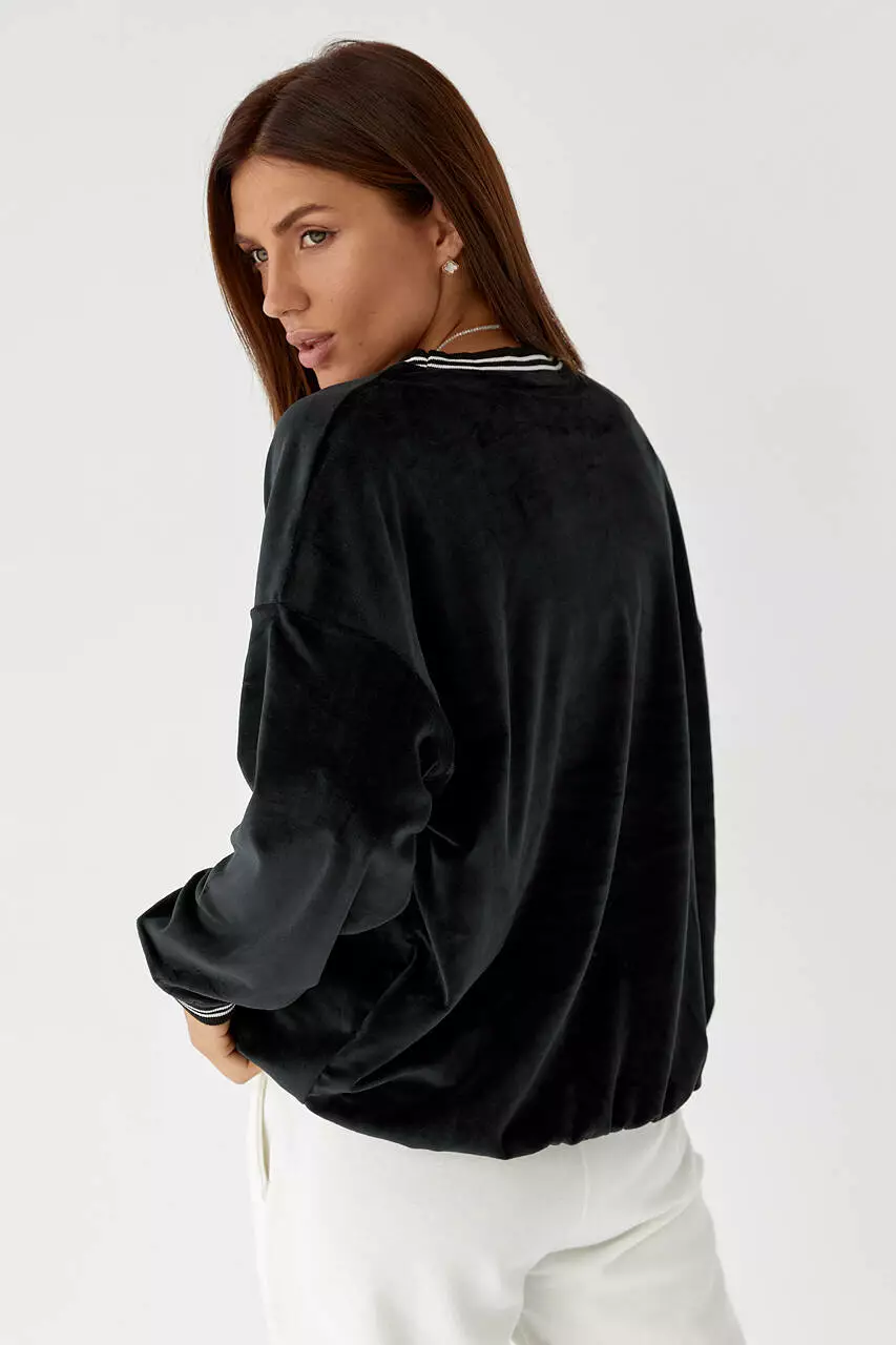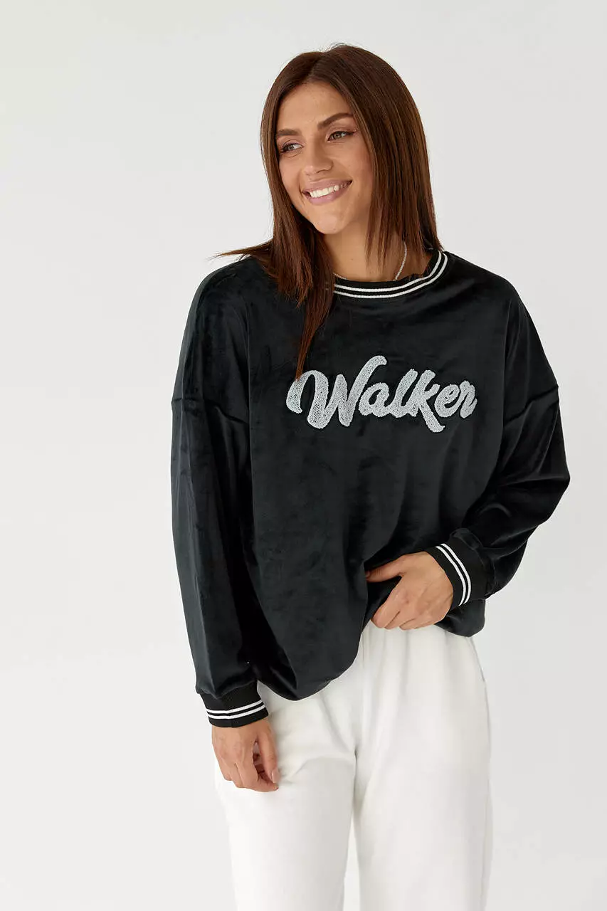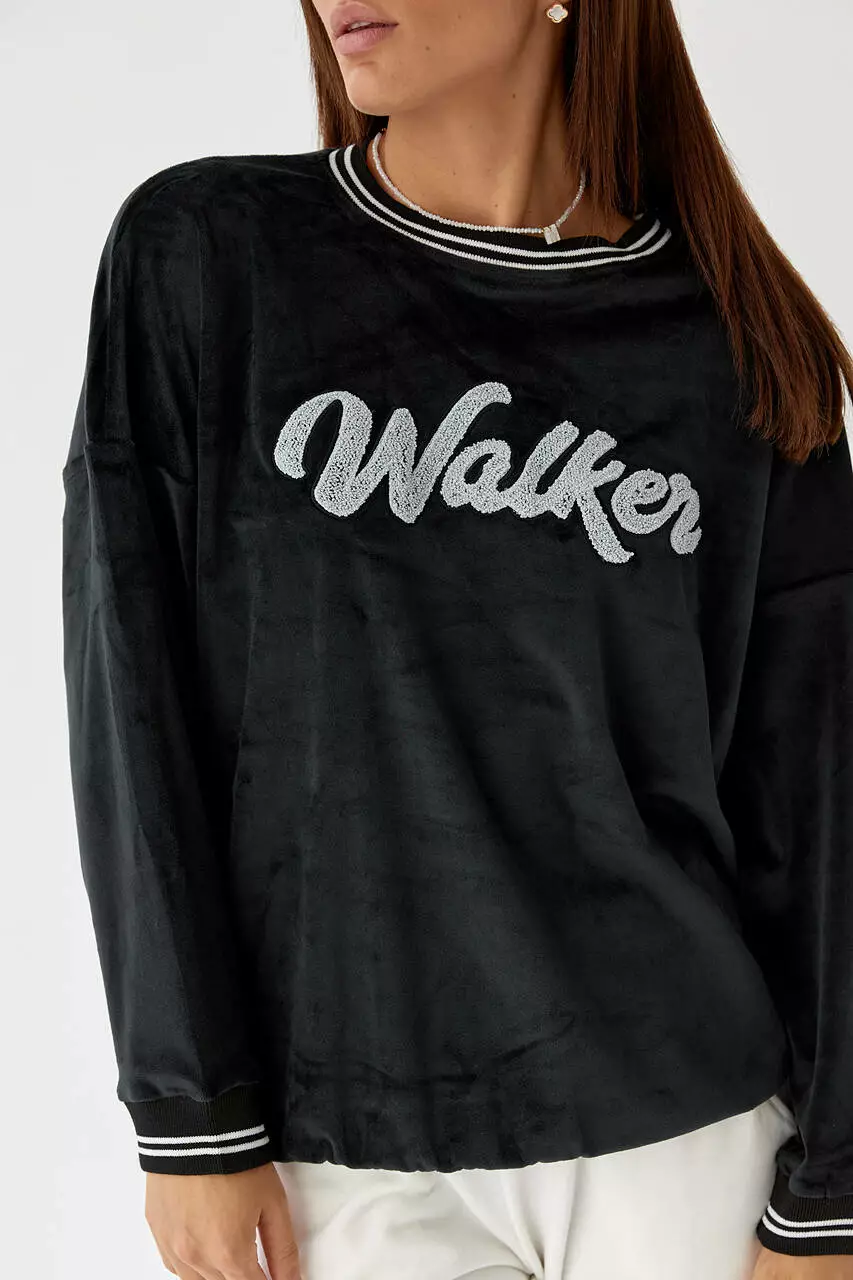 низ обшиты окантовкой в виде резинки. Спереди свитшот украшает