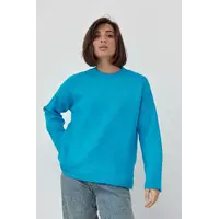 В модели oversize рукава длинные, линия плеча опущена, низ прямой. Круглая горловина дополнена коротким воротником. Рукава и низ изделия заканчиваются вязкой в виде высоких манжет.
